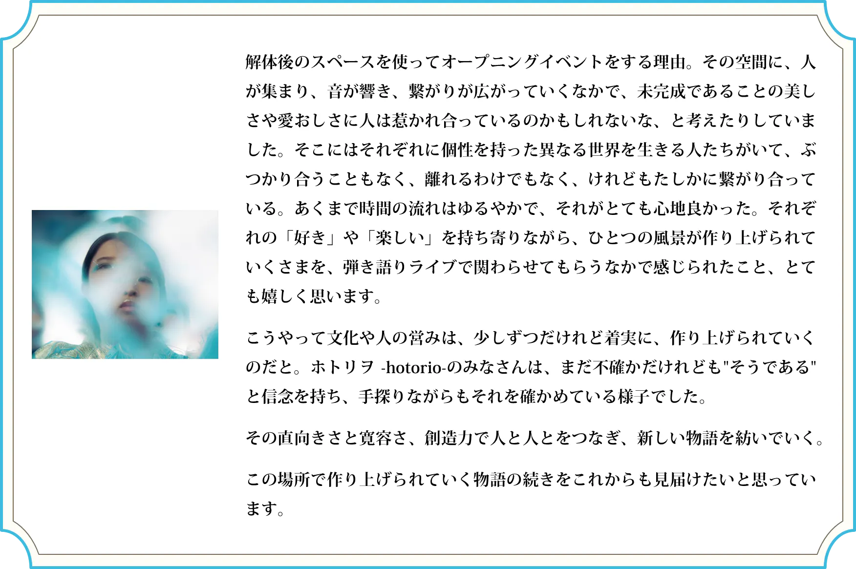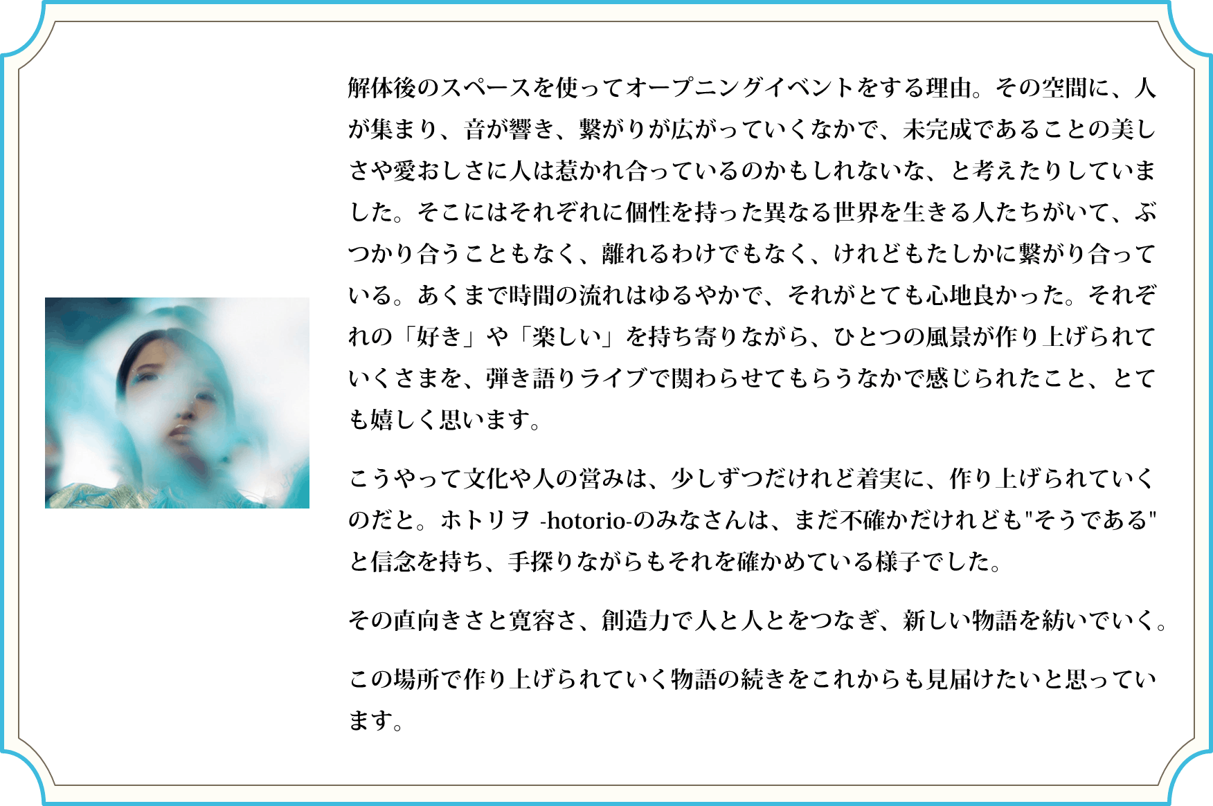 2025/07/17 11:25お久しぶりです、ホトリヲです。クラウドファンディングでいただいたご支援をもとに、遂に扉を設置しました!涼しく、さらに居心地のいいお店になりました。ご支援いただき、本当にありがとうございました!もう一つお知らせがあります…ホトリヲ グランドオープン 8/30(土)に決定現在準備しているシェア型書店の営業が始まります。ぜひホトリヲへ。お待ちしております。そんなホトリヲは、7/5(土)にオープニングトークイベントを開催。「水辺のお店のはじめ方」をテーマに、ホトリヲのこれまでをお話しました。トークの後はお越しいただいたみなさんとの交流会を開催。棚主さんはまだまだ募集中です。ホトリヲの最新情報はInstagramやwebサイトでチェックしてください♪Instagram https://www.instagram.com/hotolio_webサイト https://hoto-lio.studio.site もっと見る