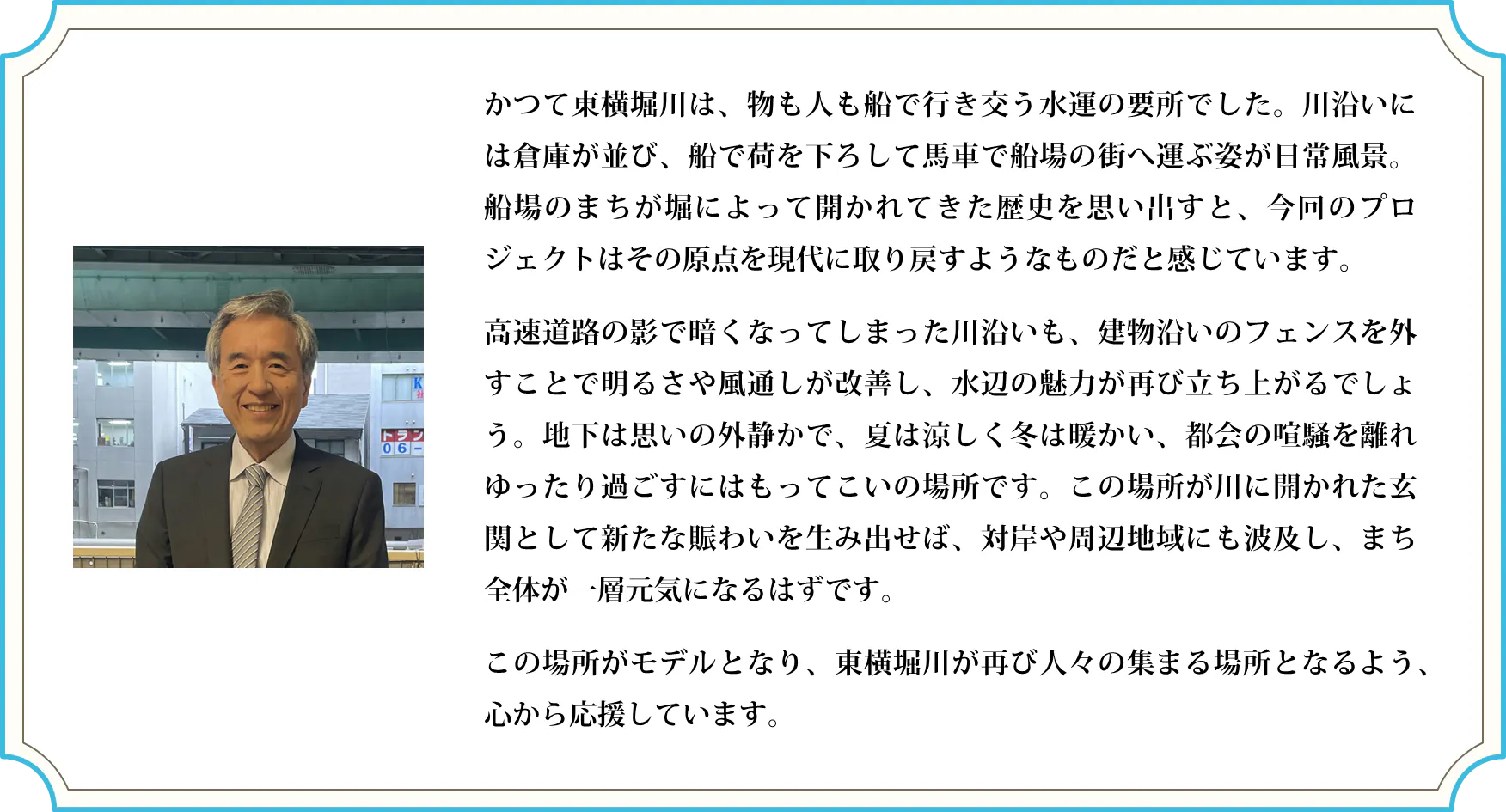高速道路に閉ざされてきた都市の裏側をひっくり返し、コアな魅力が溢れ出る水辺にしたい。
