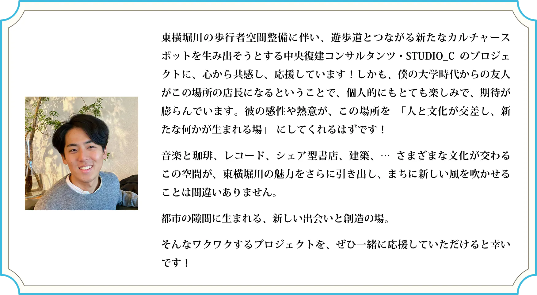 ポテンシャルにあふれたこの場所で、東横堀川の環境を活かしたイベント企画や、生活の一部となれるようなささやかなお店作りに尽力していきます。
