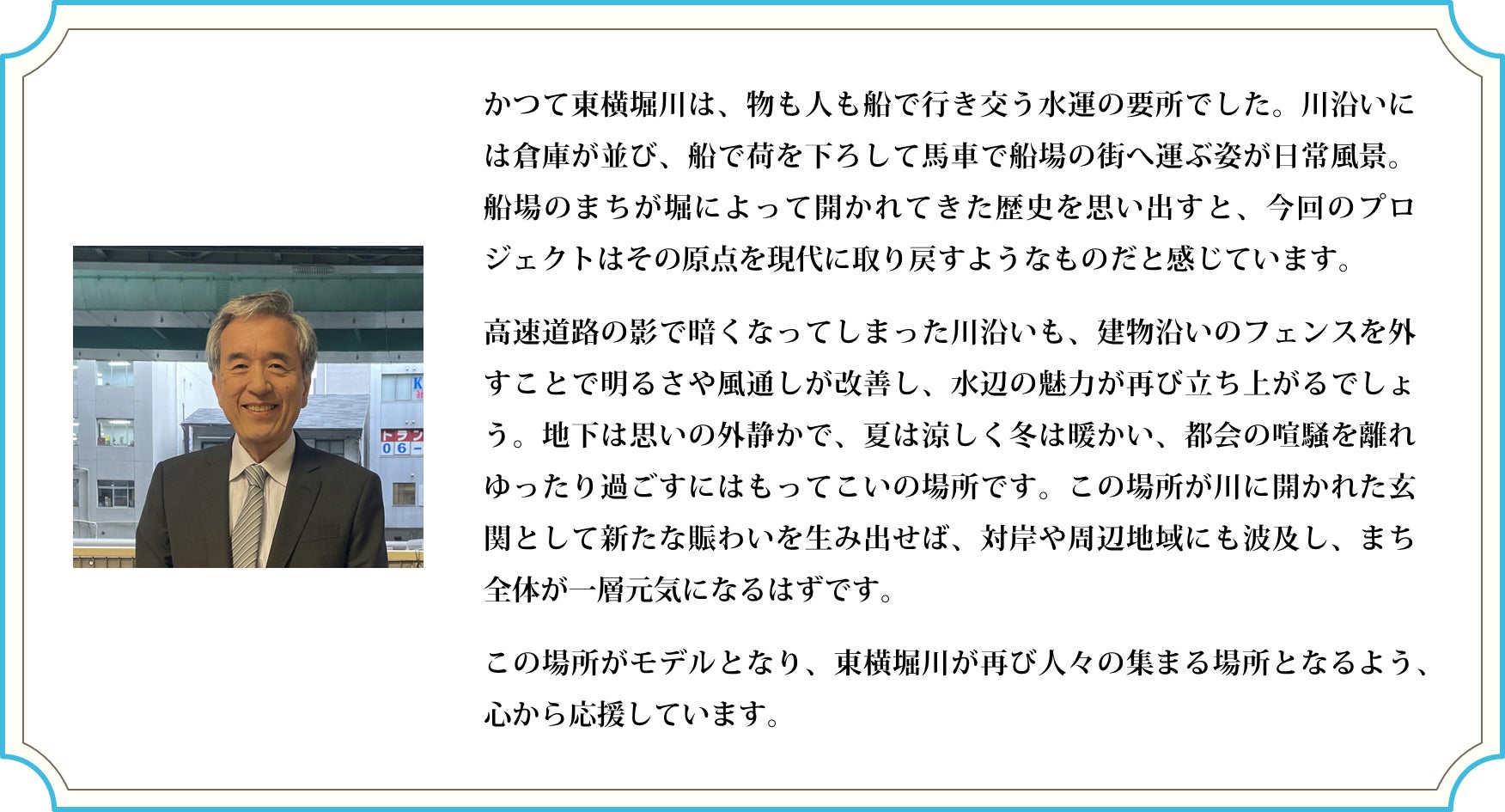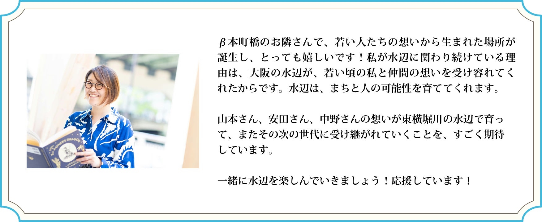 都会の喧騒から隠れた何とも言えない東横堀川の居心地の良さに惹かれ、この水辺をいい場所に変えていけるよう日々奔走しています。生活の一部として立ち寄りたくなるよう場所づくりを目指しています。