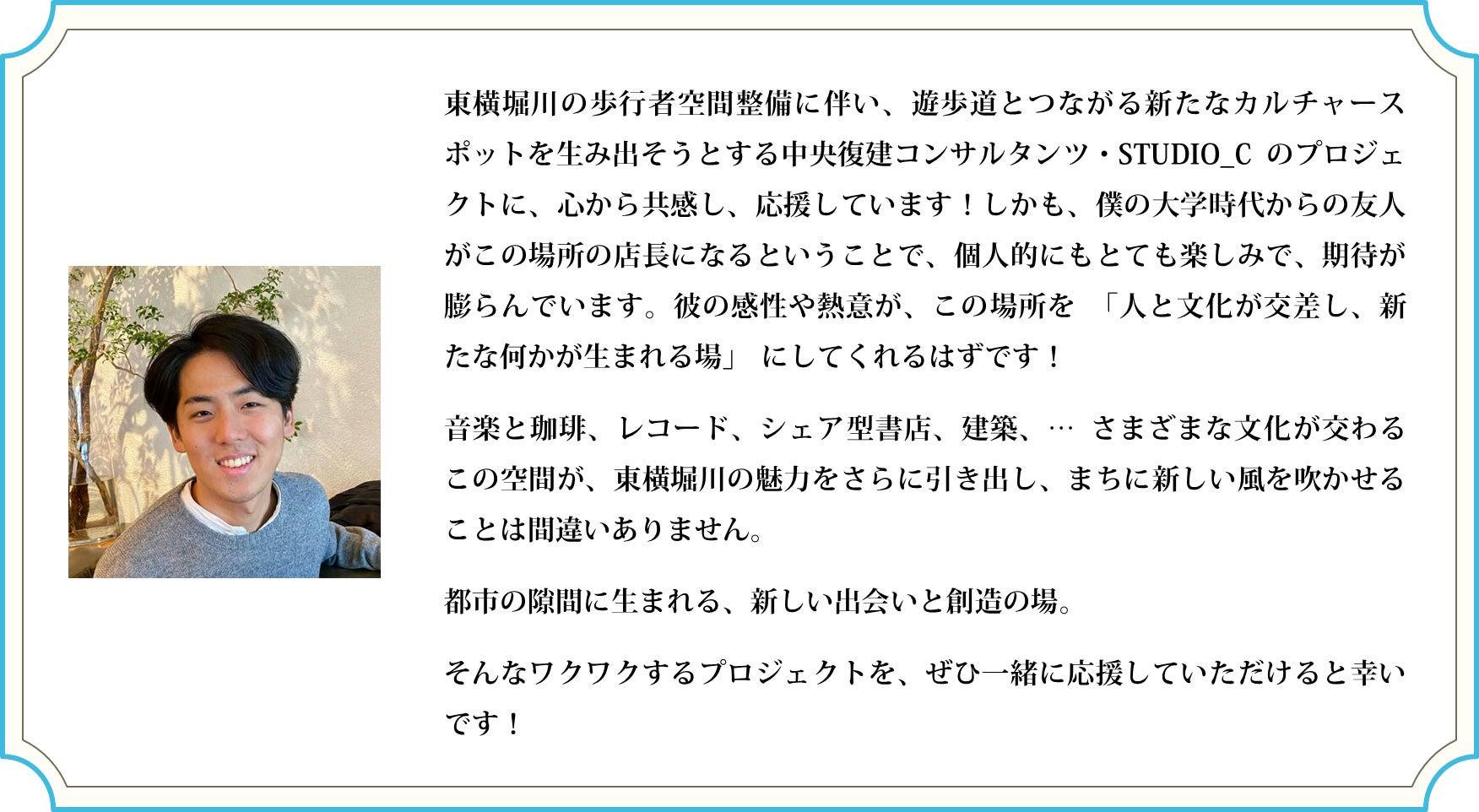 ポテンシャルにあふれたこの場所で、東横堀川の環境を活かしたイベント企画や、生活の一部となれるようなささやかなお店作りに尽力していきます。