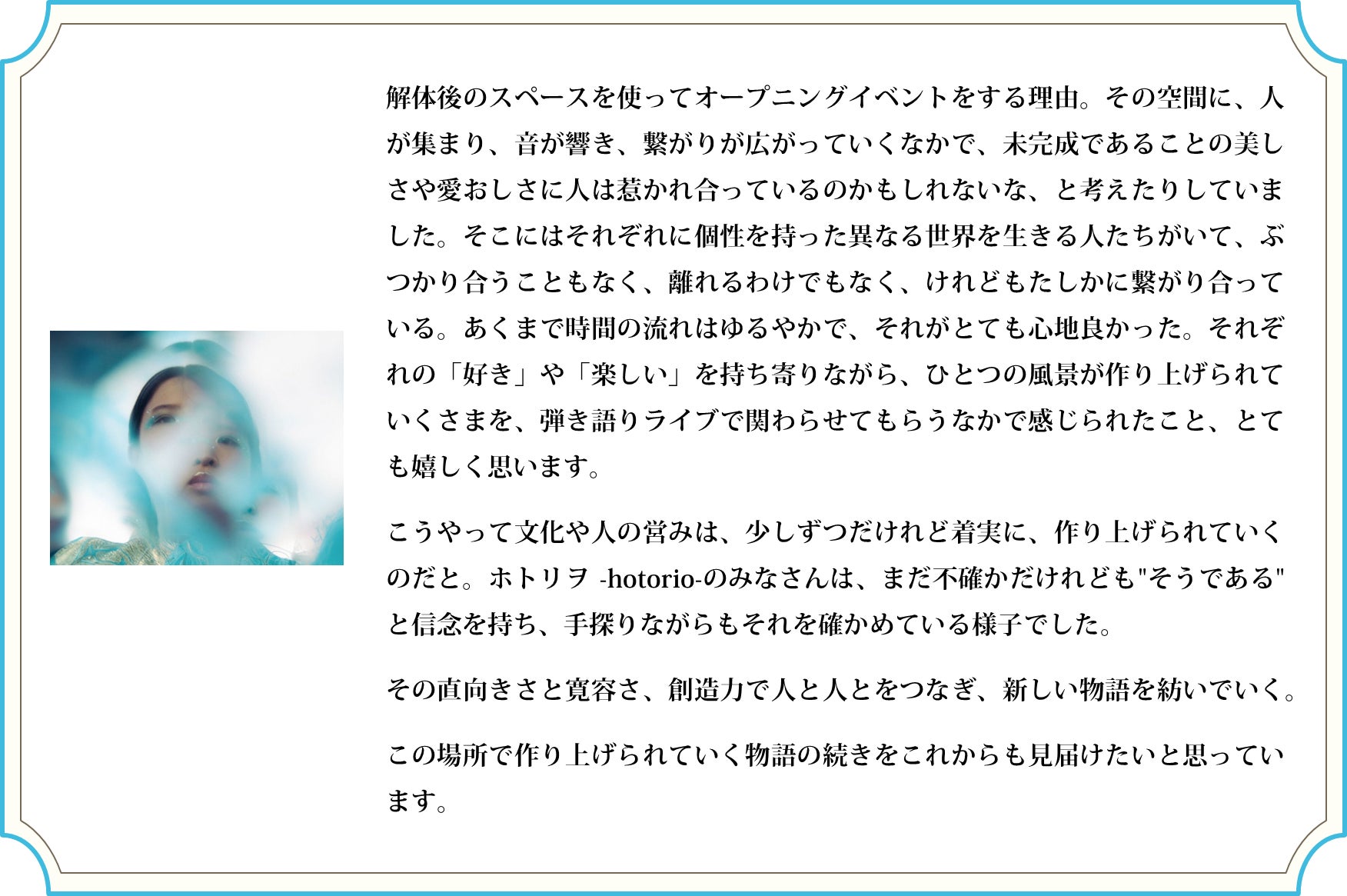 2025/07/17 11:25お久しぶりです、ホトリヲです。クラウドファンディングでいただいたご支援をもとに、遂に扉を設置しました!涼しく、さらに居心地のいいお店になりました。ご支援いただき、本当にありがとうございました!もう一つお知らせがあります…ホトリヲ グランドオープン 8/30(土)に決定現在準備しているシェア型書店の営業が始まります。ぜひホトリヲへ。お待ちしております。そんなホトリヲは、7/5(土)にオープニングトークイベントを開催。「水辺のお店のはじめ方」をテーマに、ホトリヲのこれまでをお話しました。トークの後はお越しいただいたみなさんとの交流会を開催。棚主さんはまだまだ募集中です。ホトリヲの最新情報はInstagramやwebサイトでチェックしてください♪Instagram https://www.instagram.com/hotolio_webサイト https://hoto-lio.studio.site もっと見る