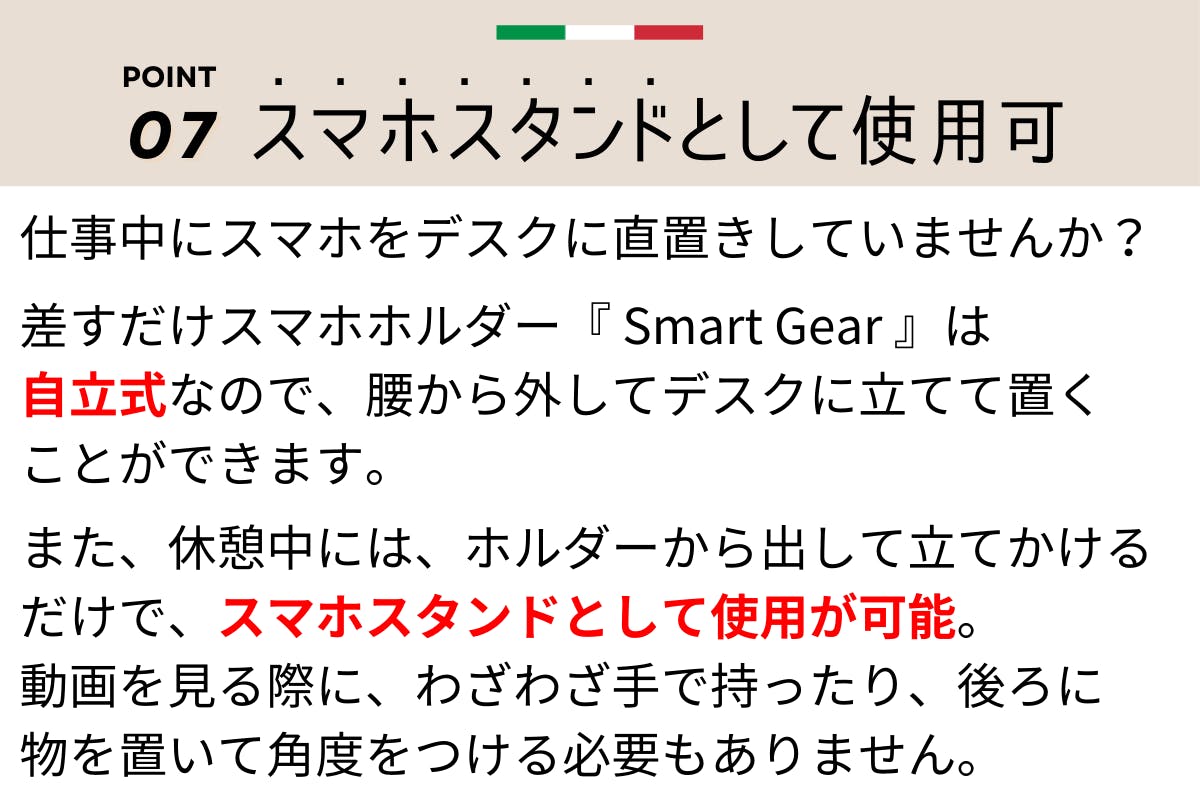 「Smart Gear」は自立式。スマホを取り出して立てかければ、スマホスタンドとしても使用が可能です。