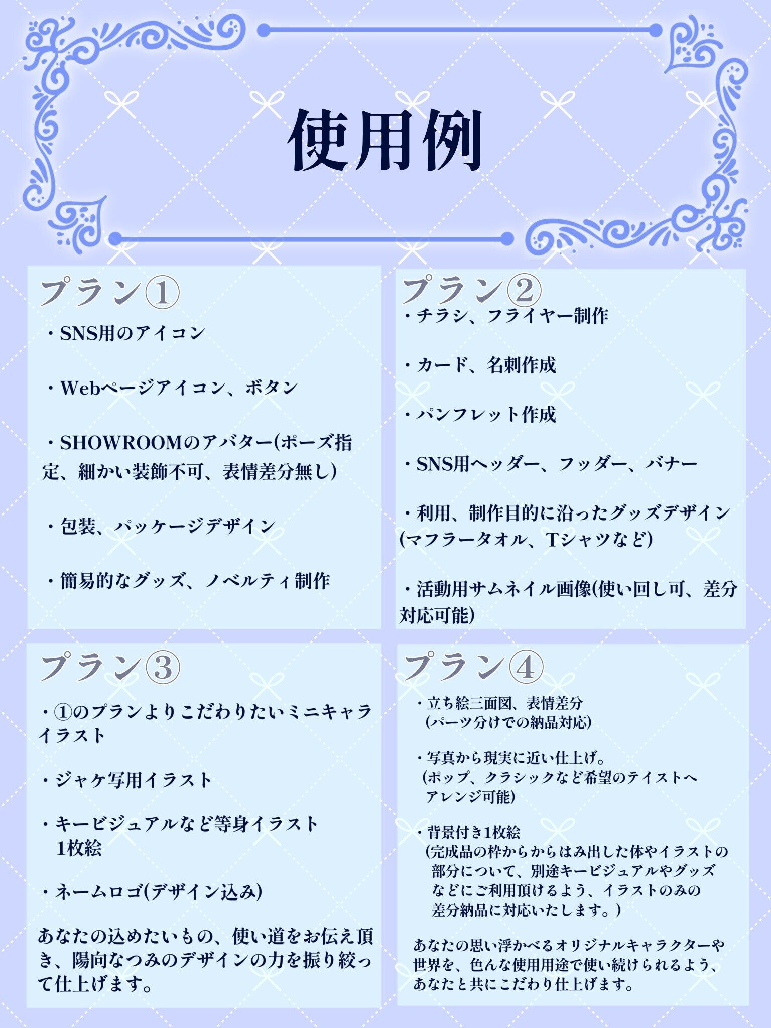 ①のプランよりこだわりたいミニキャライラスト、ジャケ写用イラスト、等身イラスト、1枚絵、ネームロゴ(デザイン込み)などに対応。あなたの込めたいもの、使い道をお伝え頂き、陽向なつみのデザインの力を振り絞って仕上げます。