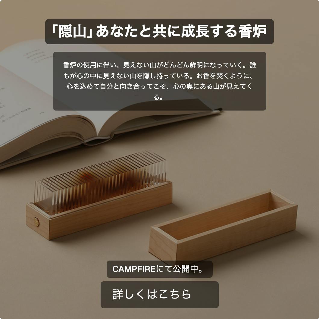 クラウドファンディング終了まで、いよいよ残り6日となりました!現在までにご支援いただいた皆さま、本当にありがとうございます。「隠山」は育てる香炉というユニークなコンセプトをもとに開発されました。使えば使うほど表情が変わり、自分だけの風合いを楽しめるのが最大の魅力です。最後まで走り抜けられるよう、全力で取り組んでまいります。ぜひ最後までよろしくお願いいたします。