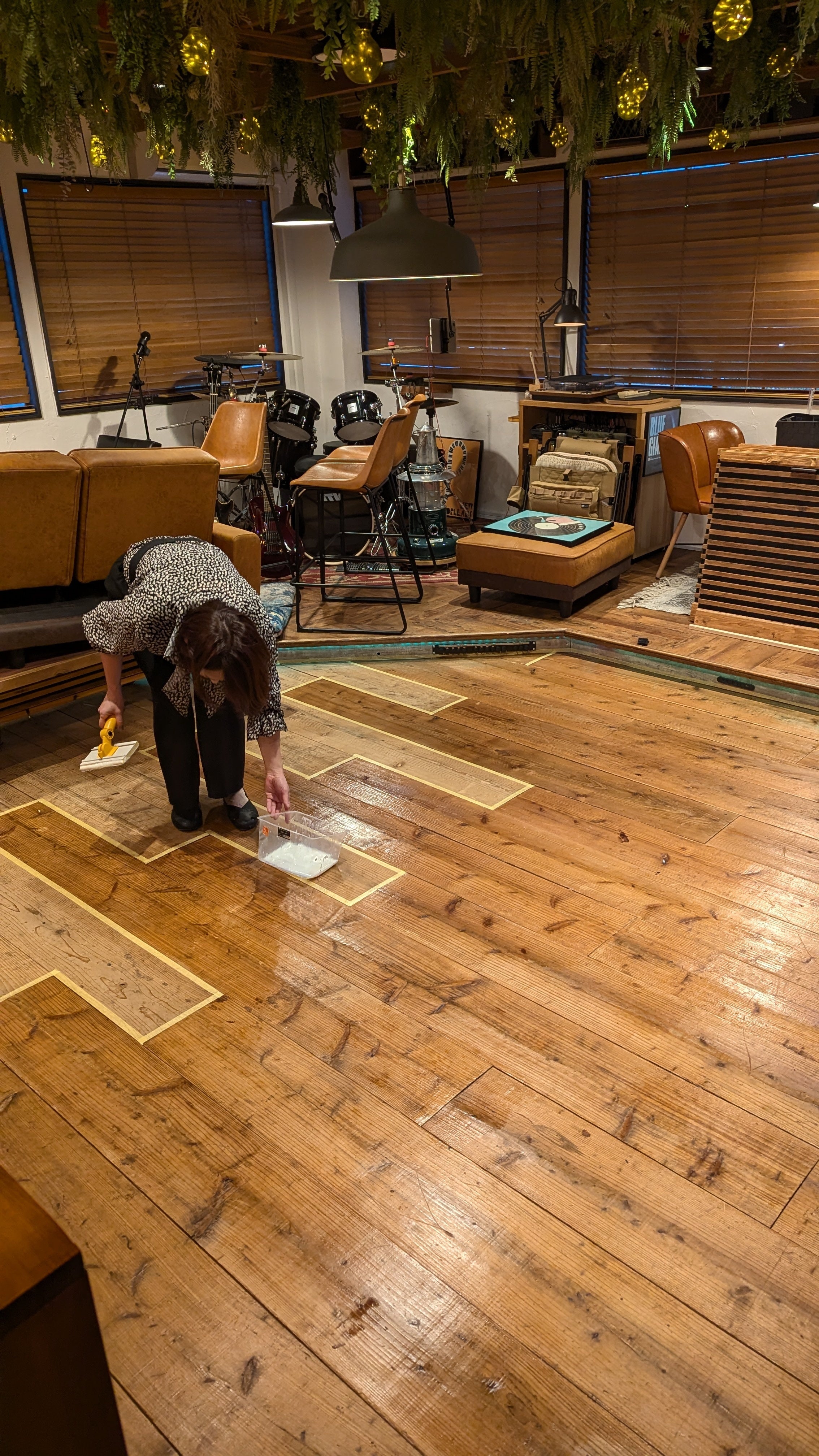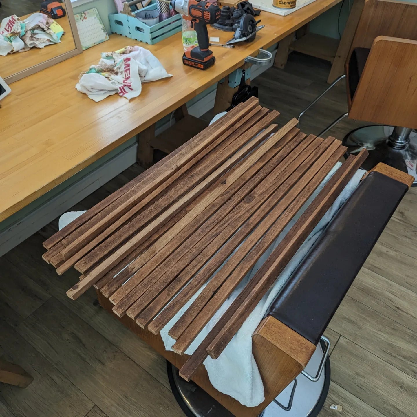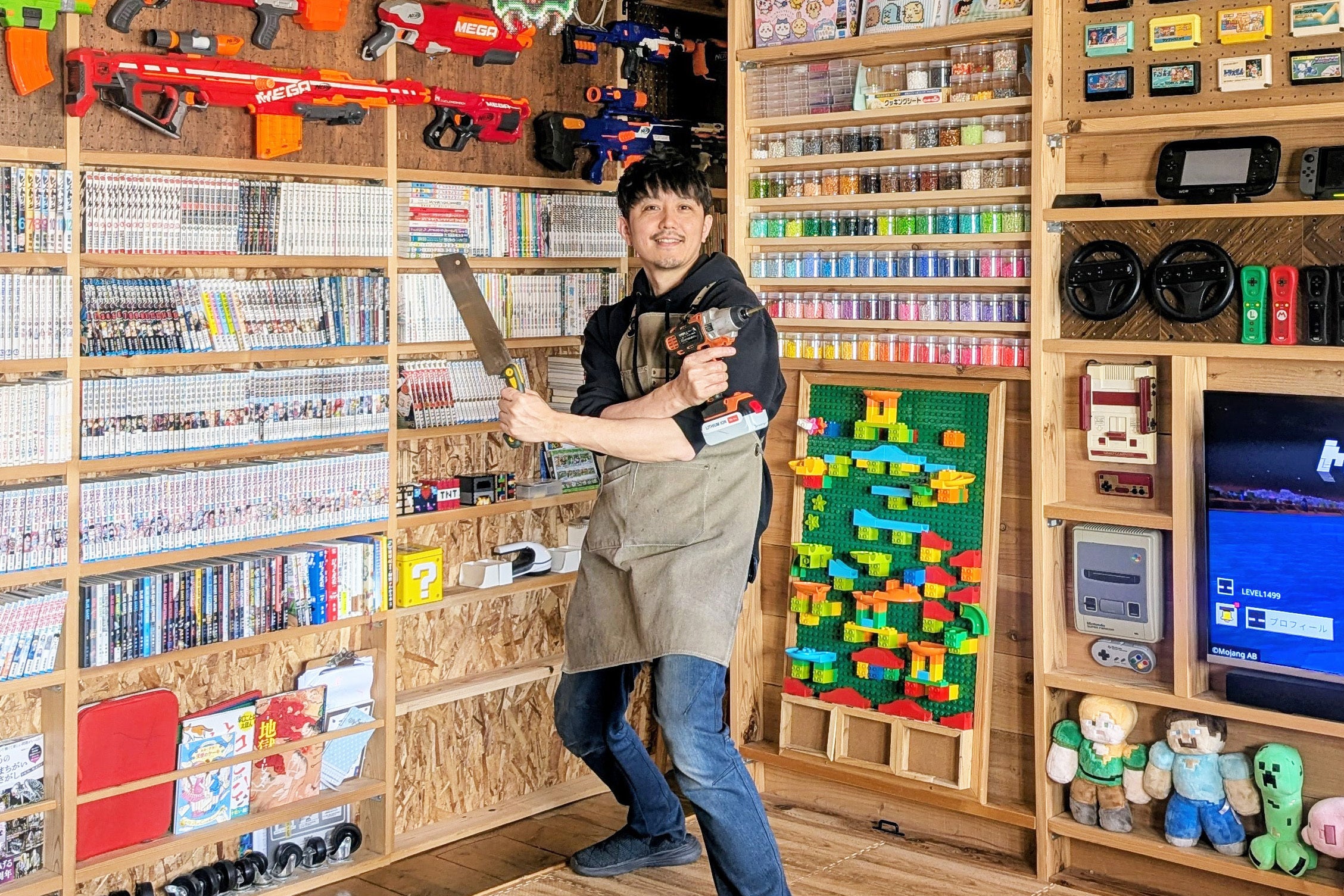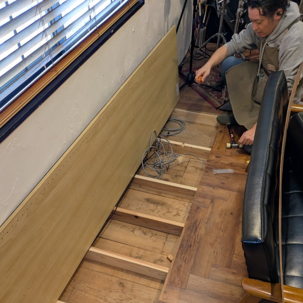 2026/04/02 01:31【No.1 壁の増設】美容室とバーのエリアを完全に仕切るための壁と扉を増設しました。保健所の規定をクリアするための初めの一歩。この時はまだ美容室としても稼働していたので大がかりな作業は基本、美容室営業後の深夜に一気に行います。万が一にも崩れ落ちるようなことは許されない大きさなので、壁へのビス止めと脚の2点で支えます。ようやく形になりつつある壁面収納ですが、1年後にすべて撤去して少し別の形に。苦労して作ったのに、使わない事もDIYでよくあること。【No.2】バー入口ドア経費削減も兼ねて美容室内に大量に保管してある端材を再利用して作りました。質感、色、厚みはバラバラだけど唯一無二のデザインになりました。ドアハンドルをつけて動作確認。裏面はシンプルなデザインに。このあといったん外して、ニスで塗装していきますが、同時進行で何枚もドアを作っているのでニス塗は後日一気に行いました。【No.3美容室連絡ドア】バーが営業しない期間や大型の荷物の搬入の為に、両開き出来るドアを設置します。ドアを斜めに設置する難しさよ…。向こう側の人の気配を感じられるように、安価で加工性もよい中空ポリカをガラスの代わりに採用しました。中空ポリカは大好きな建材で、店内のいたるところに採用しています。バー入口ドアと一緒に塗装開始。塗装中は匂いもきつく、作業スペースもかなり必要なので美容室の一室を2日間貸切で一気に4度塗りほどニスを塗り重ねました。あまり好きではない作業ですが艶と重厚感が増すので作業終了後の満足感は高いです!【No.4美容室入口ドア】直前につくった2種のドアにくらべたらなんてシンプルな構造!ドア作成耐性も上がっているのであっという間にできました(^^【No.5トイレ連絡ドア&壁】法律上、飲食店は洗面所が必須、美容室は必須ではない、飲食店利用客は美容室エリアに立ち入れない、美容室利用客は飲食店エリアに立ち入りOK、というルールをクリアするための必須工事。入社したばかりの美容師さんにもガンガンお手伝いしてもらいました!美容室側のシャンプーエリアのイメージが大分変っているのでドアのデザインも牢屋風。流行りのレーススライド機構を採用しました。想像の5倍は大変でした。他にも美容室エリアのドアも二つほど追加し、短期間に合計7枚のドアを作りました。マイクラのドアづくりを手伝ってくれる美容師さんたち。頼もしいです。良い出来です(^^♪飲食店にはトイレが必須、美容室にはトイレは不要、飲食店利用の方は美容室エリア立ち入り禁止、美容室利用の方は飲食店エリアの立ち入りはOK、という難解なルールをクリアする為にむりやり増設した壁。デコレーションは本当にカオス。【No.6ネザーゲートドア】IKEAの大型ワードローブのスライドドアを再利用。中央をくり抜いてマイクラのネザーゲート風のドアを作りました。デザインはシンプルですが、中央の紫の部分を怪しく光らせるのに苦労しました。将来的にバーエリアの一部をマイクラのネザー風にしたいのでそれの入り口のドアになります。法律上は必要のないでドアなので完全に趣味の一環です。マイクラ好きに刺され!【No.7ライブステージ】ミュージックバーと言えばステージ。コーナーエリアに作っていきます。将来的にステージ下に配線を巡らせることを視野にいれて根太の位置を決めます。床板はネザーゲートドアにも利用したIKEAのワードローブを解体して再利用。フロアタイルを100枚以上貼りました。数年ぶりに徹夜作業( ;∀;)あちこちに配線用の連絡穴をあけておきます。淵に見切り材を。引き締まります。見切り材の下に間接照明を仕込みます。暗いバー空間では足元を照らす役割も果たします。ラグを敷いてドラムを設置。最高です( *´艸`)【No.8レコードラック】レコードプレイヤーとレコードを収納できるラックを作成。脚はこたつ脚。ホームセンターで『こたつ脚』として売っていました。そんな需要があるんですね残念ながらこちらのレコードラックもバー営業開始前に2025年に解体しちゃいました( ;∀;)【No.9キーボードスタンド】88鍵盤のシンセサイザーにピッタリの収納など存在しないので作っていきます。折り畳み式の脚を広げるとスタンドに。使わないときは飾り棚。もしくはローテーブルに【No.10壁面CD,DVDラック】10年前から美容室で使っていたウォールラック。納まりのよい場所が見つかってよかったです(^^ちなみに10年前は入口横の壁に。懐かしいです。バーの為のDIYは全部で44個。まだまだつづきます★ もっと見る