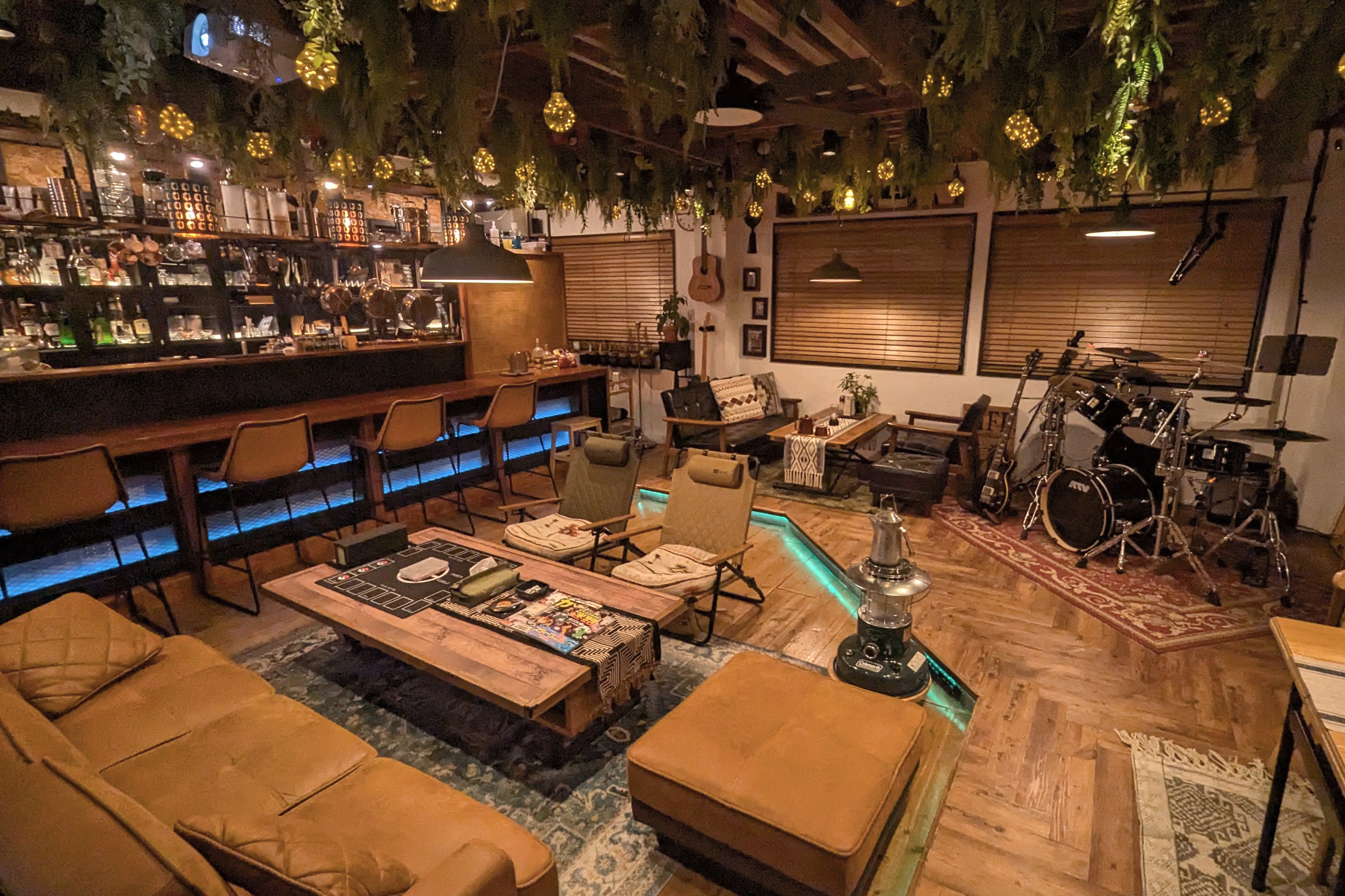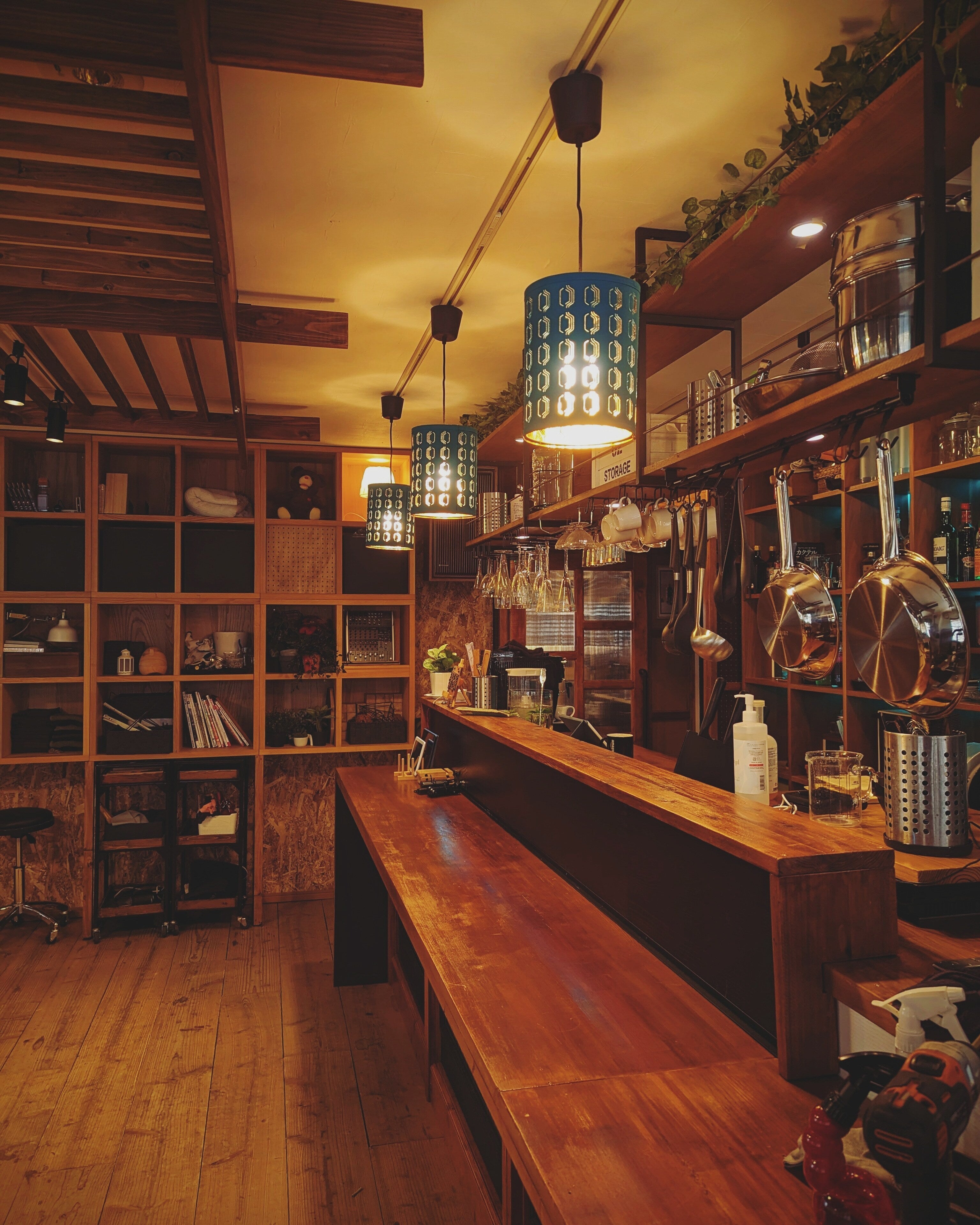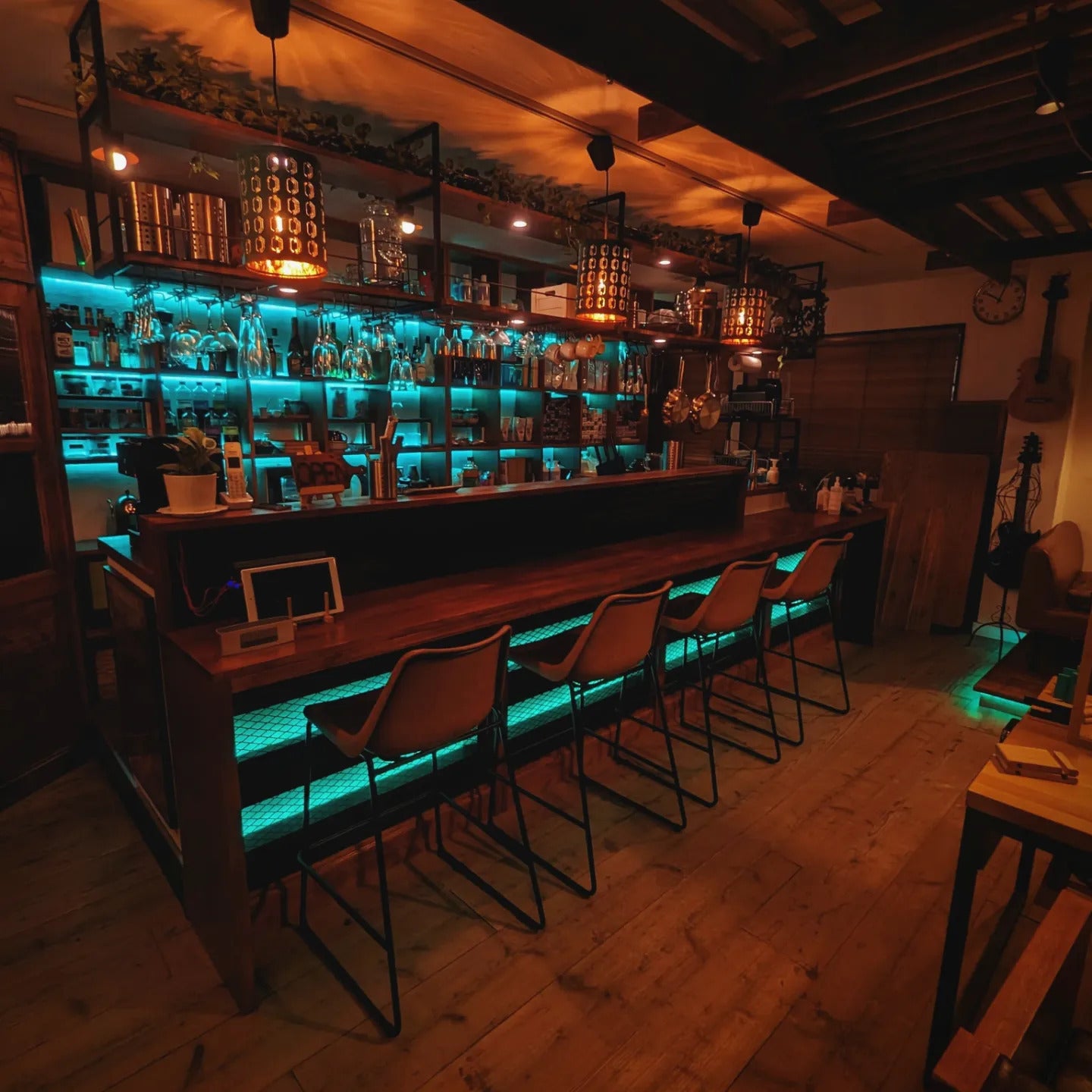 店内は、木材と緑を基調とした落ち着いた空間。DIYで一から手を入れ、既製品では出せない“温度”のある場をつくります。音楽、映像、ゲーム、そしてAIや未来技術といった知的好奇心も取り入れ、「大人が童心に戻れる夜」を演出します。