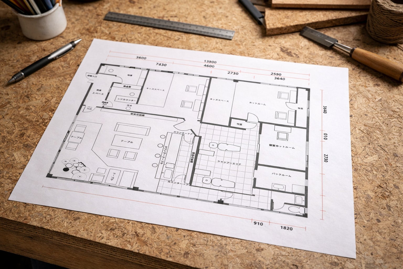 美容室と飲食店が同居するフロア。保健所に何度も足を運び、たくさん相談して作り上げた間取りです。難題でしたがとても勉強になりました。