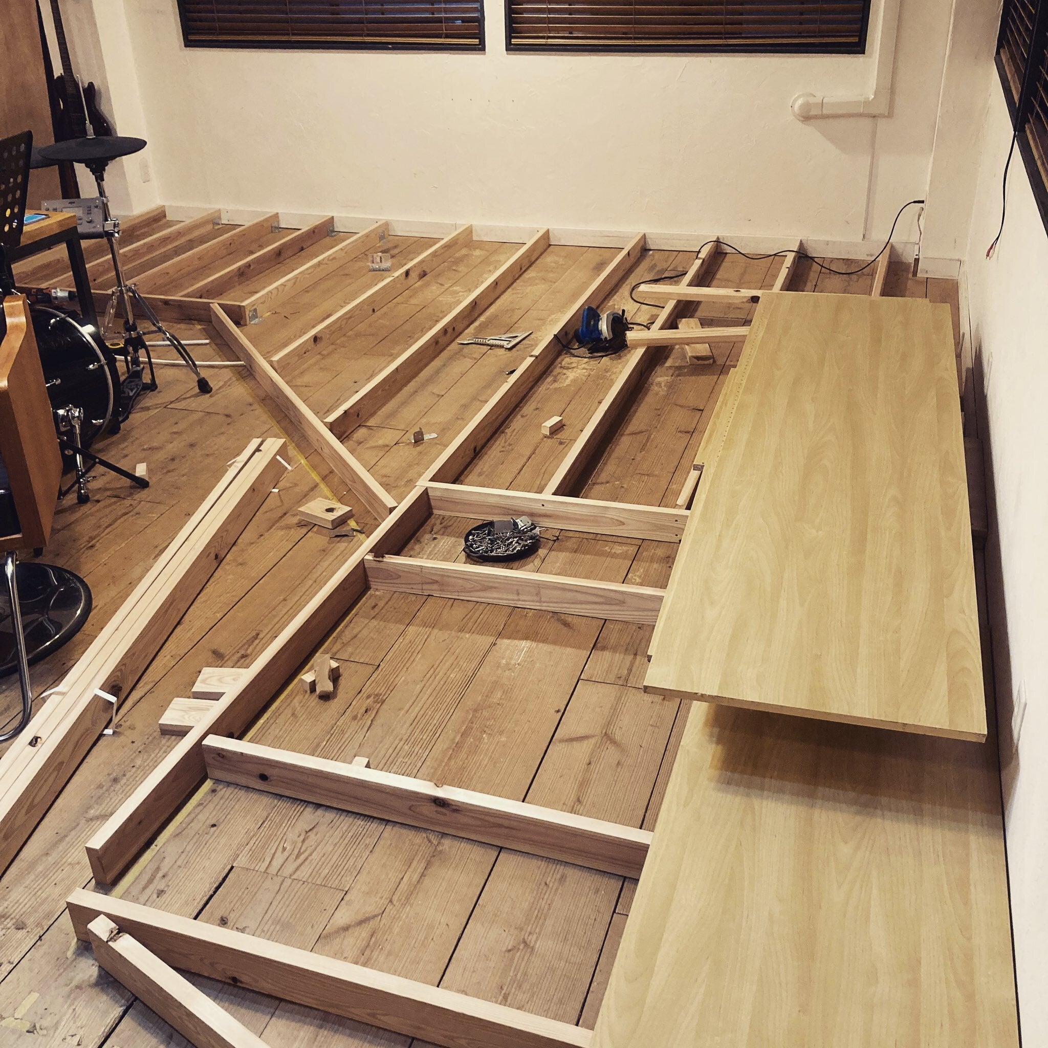 とにかく場所をとるドラムセットを定位置に配置するために急ピッチで作業しました。