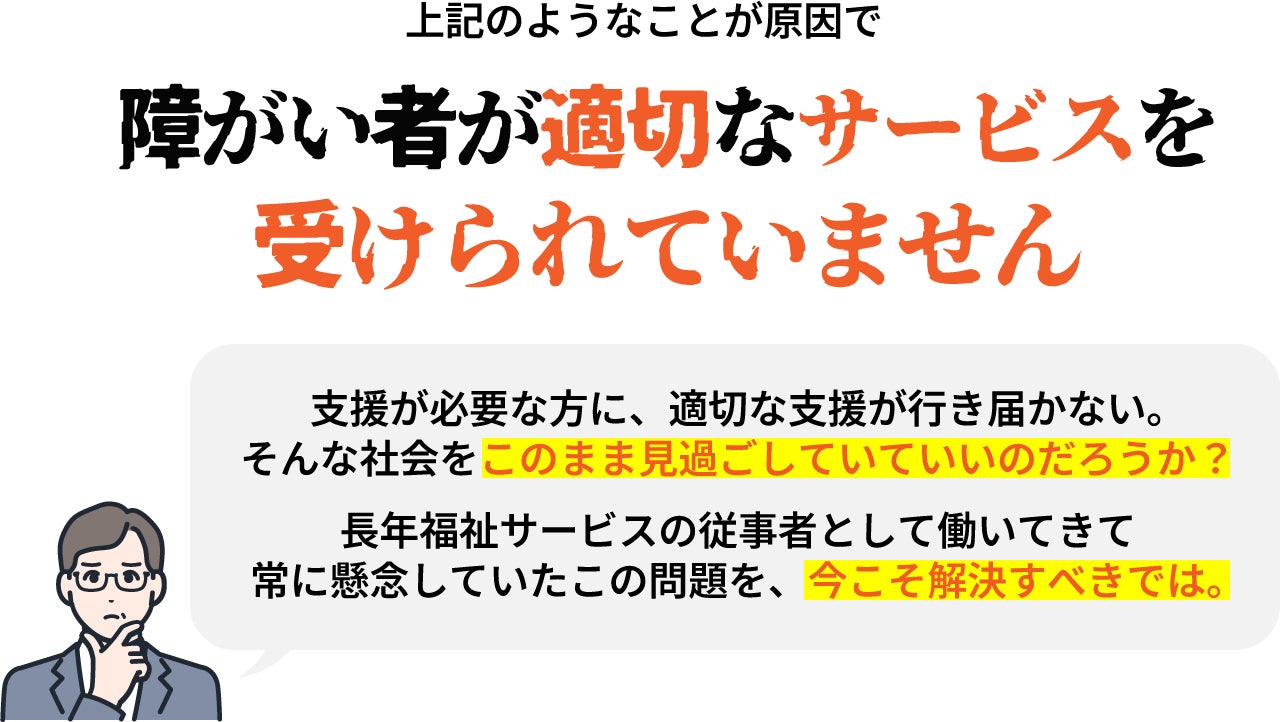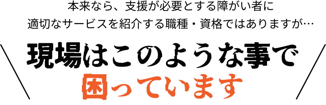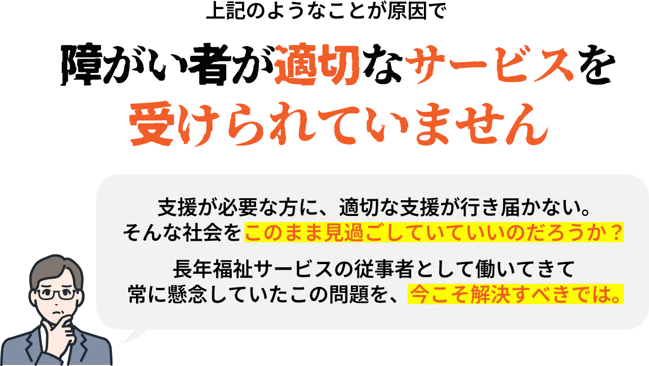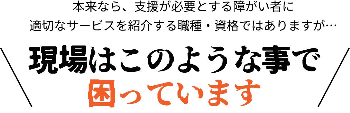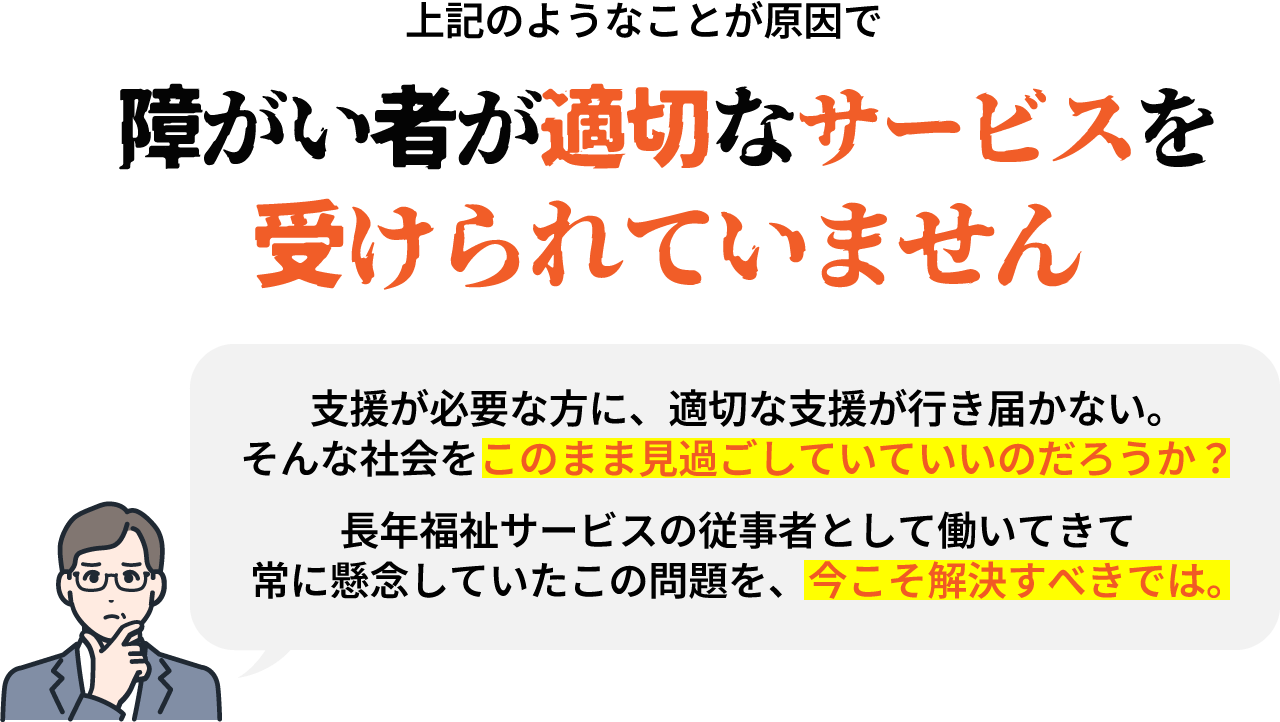 相談支援専門員による充分なサポートができず、本来受けられる支援を受けられていない障がい者がたくさんいます。中には、支援があることすら知らない方もいらっしゃいます。