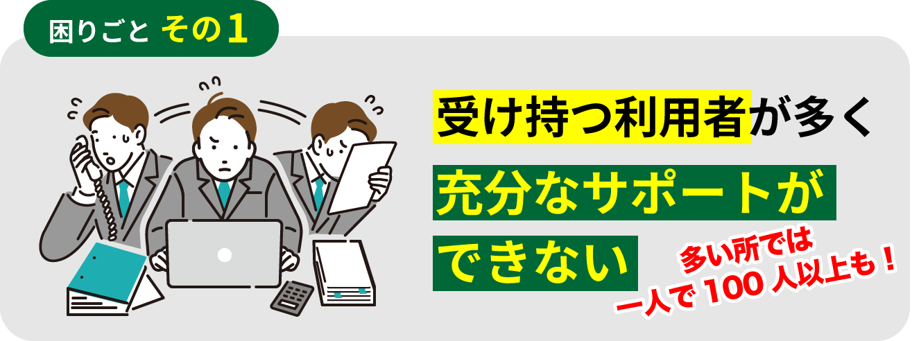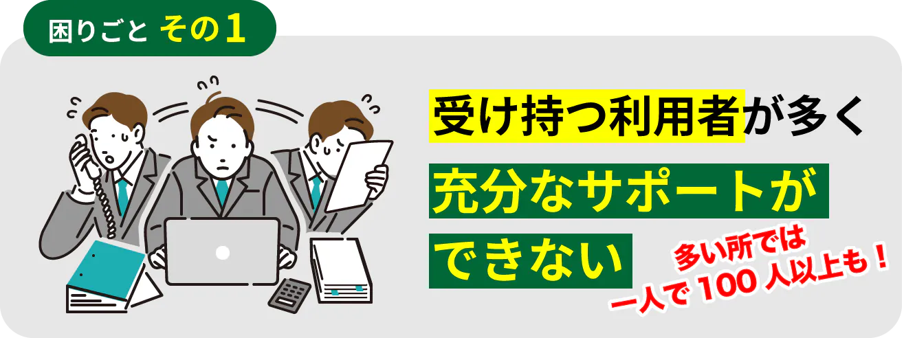 地域にもよりますが、一人で受け持つ利用者が多すぎて、充分にサポートができていない状態です。それによって利用者が適切なサービスが受けられず困っています。