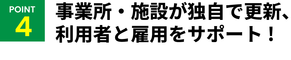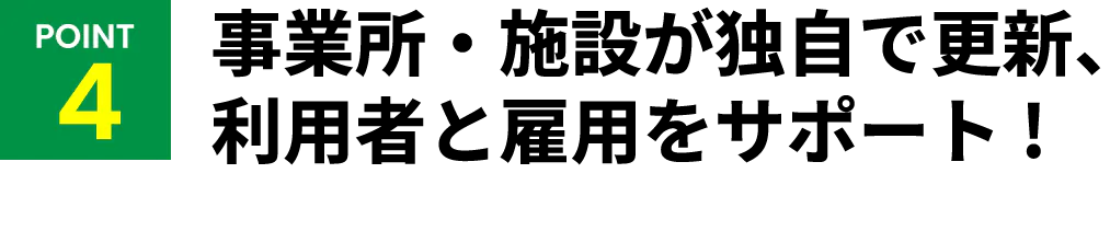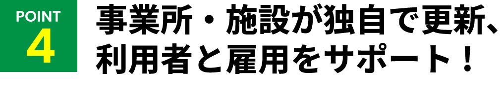 事業所・施設がポータルサイトにログインし、いつでも更新可能に。利用者は事業所・施設の検索ができ、いつでも問い合わせや相談ができる仕組みを構築します。また、採用のエントリーもできるので、事業所・施設のスタッフ募集も簡単にできるようになります。