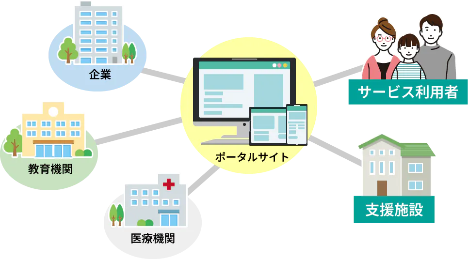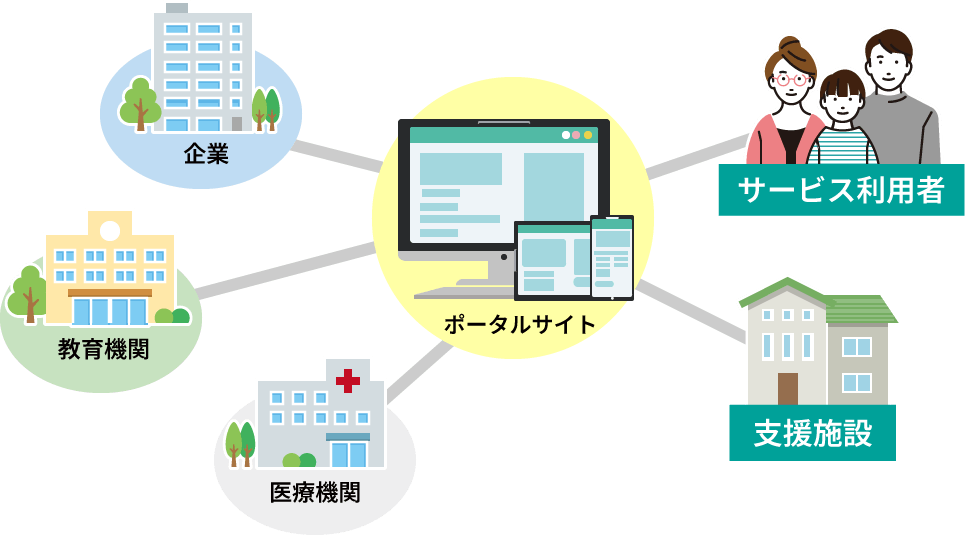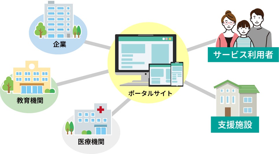 地域の企業や教育機関、医療機関と連携し、障がい者雇用枠の情報、教育機関の生徒募集や、医療機関の診療内容など、利用者に関連のある情報を、各機関と連携して掲載します。また、広告表示枠を設け、ポータルサイトの運営費用や、相談支援専門員の報酬に充てさせていただきます。