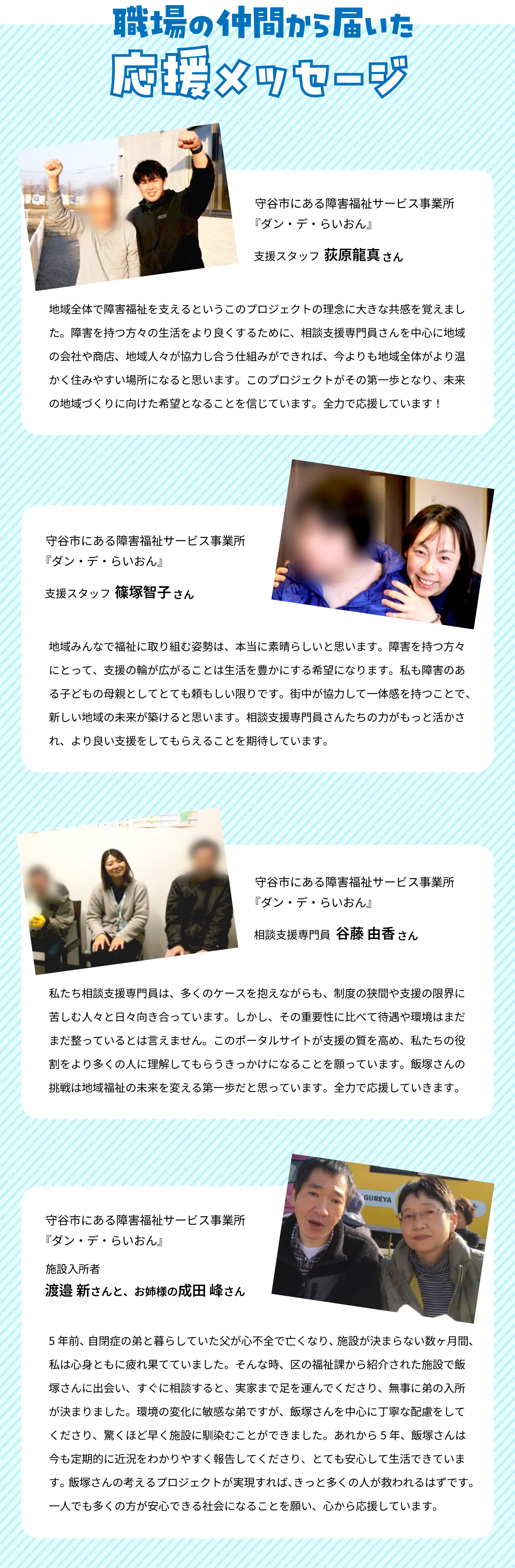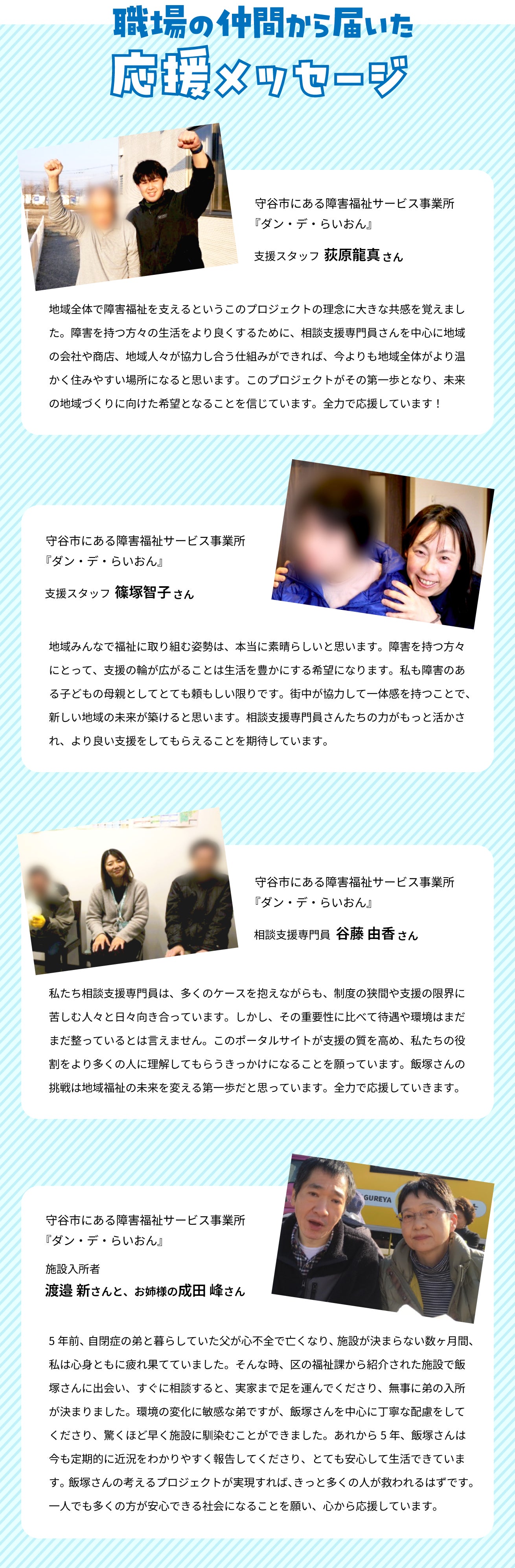 相談支援専門員の一人一人にフューチャーし、どのような支援を行っているかを丁寧に紹介。今まで縁の下の力持ちとして活躍していた専門員を、一般的に知られる業種になるよう福祉支援相談のスペシャリストとしてブランディングします。