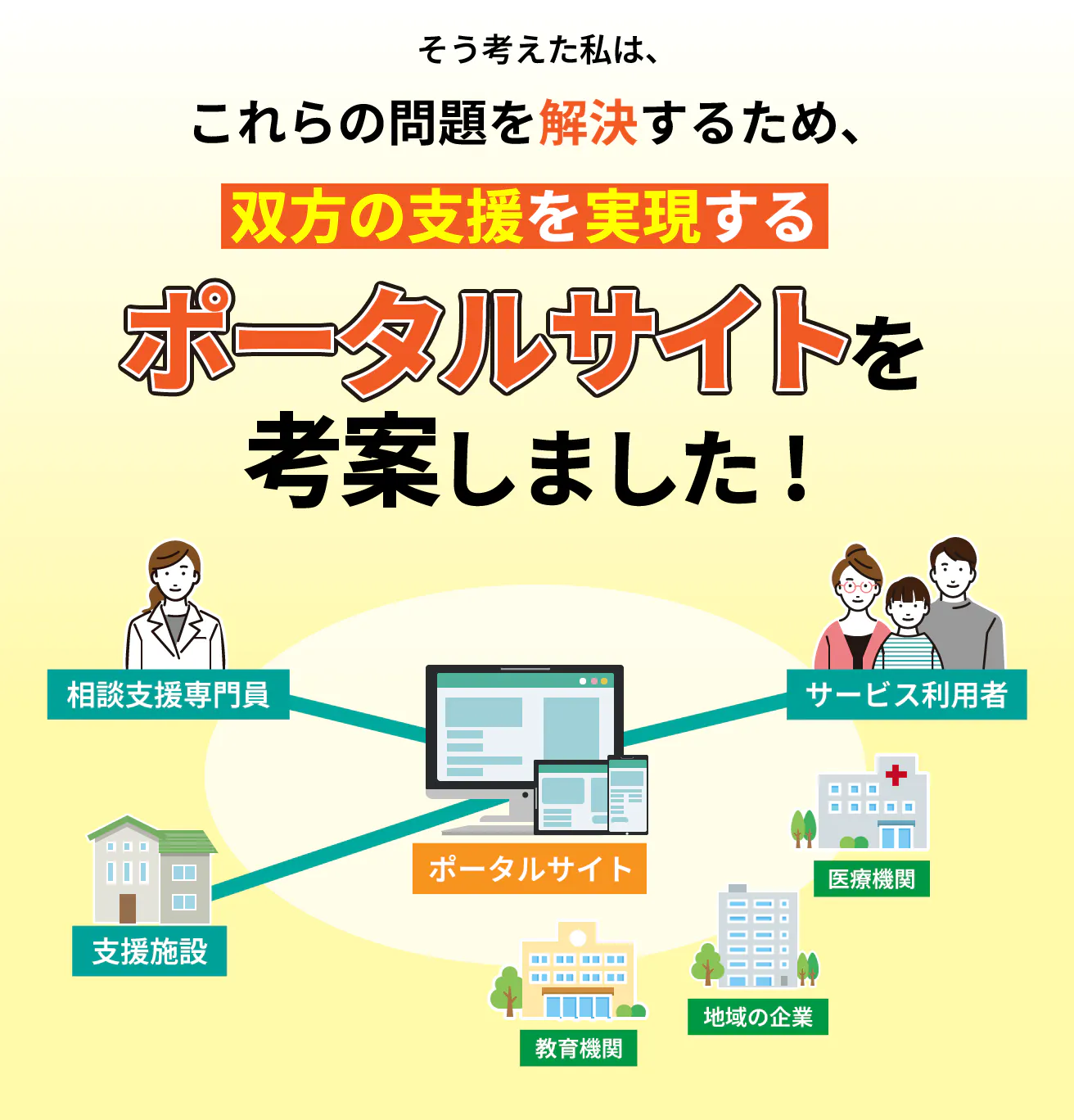 相談支援専門員、サービス利用者、支援施設それぞれを結びつける架け橋となるポータルサイトを考案しました。ポータルサイトの運用にかかる費用に関しては、一般の方からのご寄付や、地域の企業、医療機関、教育機関との相互関係によって賄えればと考えています。