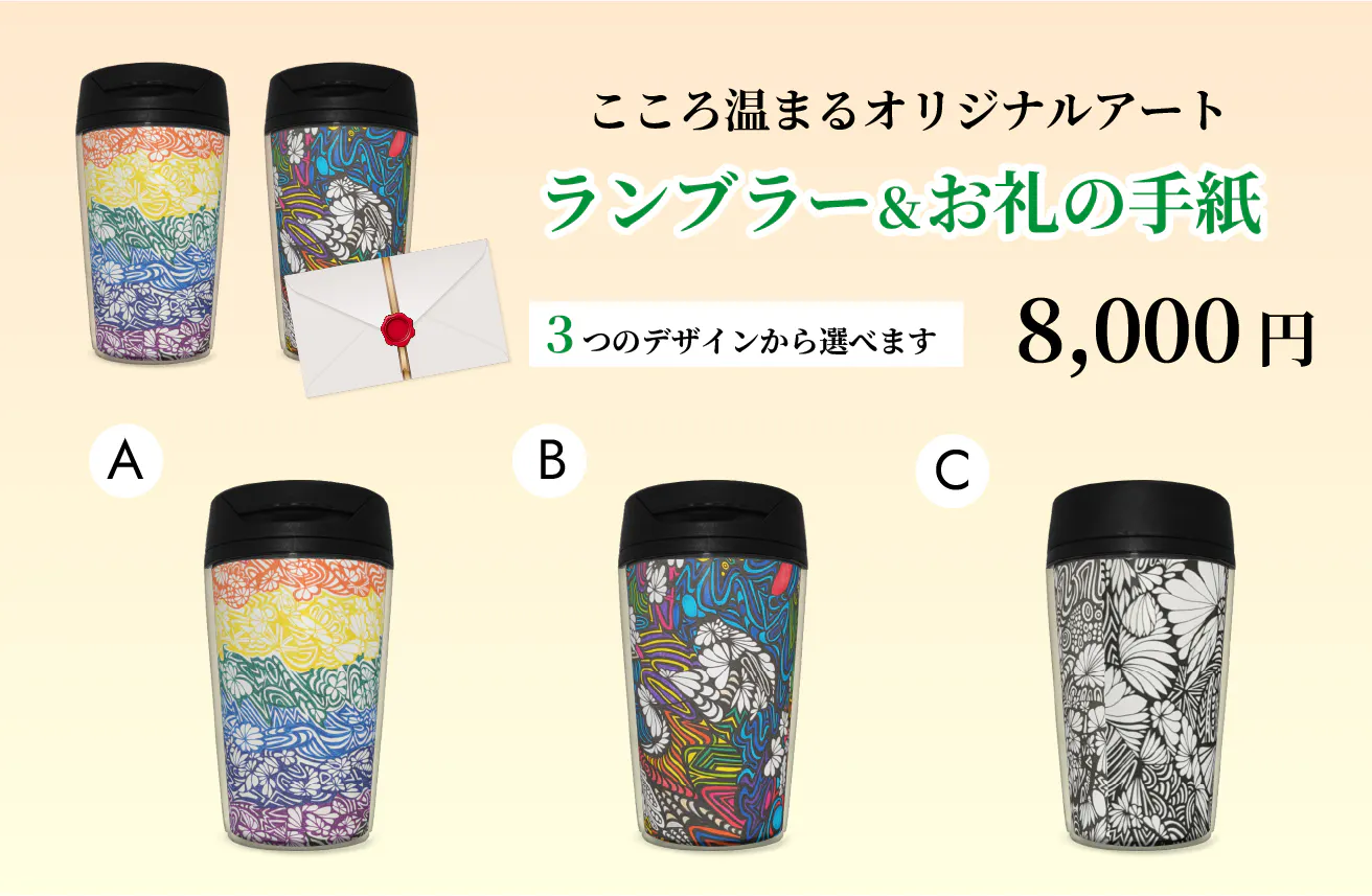 こころ温まる、オリジナルアートタンブラーとお礼の手紙を支援する