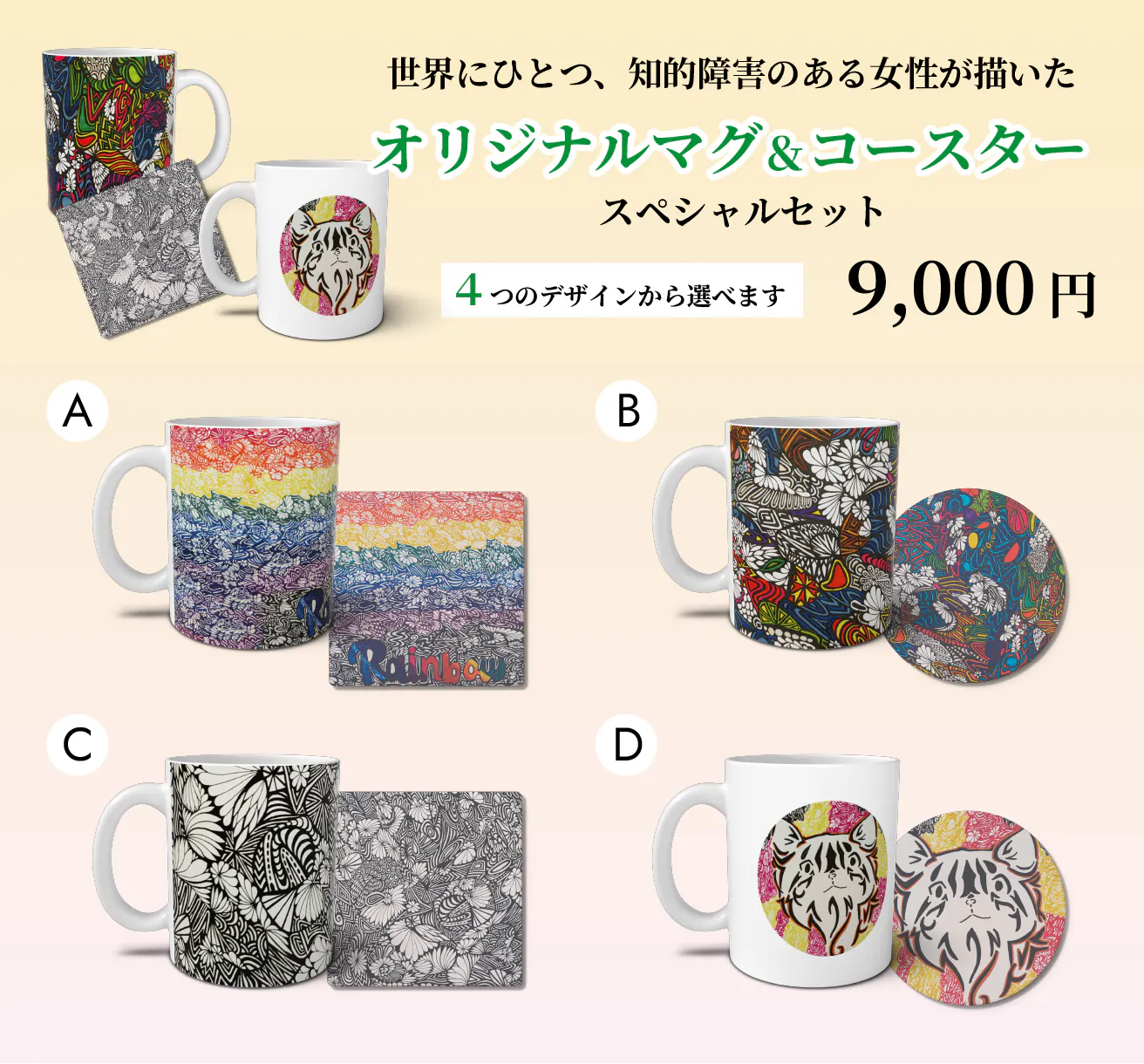 世界にひとつ、知的障害のある女性の描いたオリジナルマグ&コースタースペシャルセットを支援する