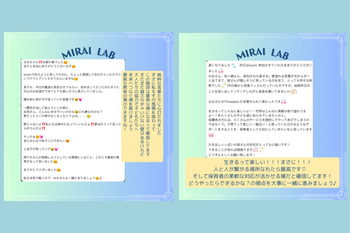 子どもだけでなく、親も、支援者も。すべての人がつながり、新しい未来を創るための「みらいLab」なのです。