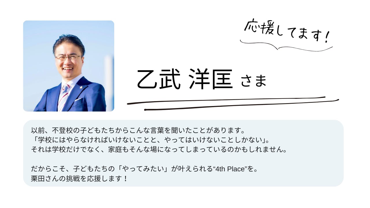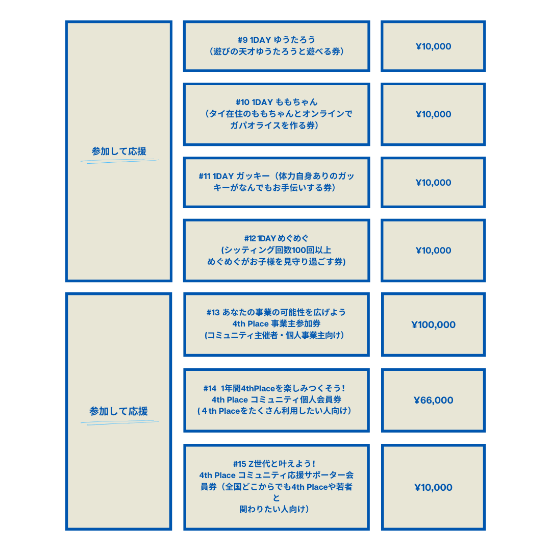 2025/05/01 01:31みなさまへ2025年4月30日 23:594th Placeのクラウドファンディングがついに終了しました!結果は…支援者数:234名支援総額:5,237,728円達成率:174%!!言葉では言い尽くせないほどの感謝で胸がいっぱいです。プロジェクトの途中では、子どもたちやZ世代そして応援してくれる大人たちの声がどんどん届き「この場所を広げていく必要があるんだ」と、何度も背中を押されました。この期間中、4th Placeは設立5周年を迎えたくさんの仲間たちと振り返り、未来を語り合うことができました。また、今回の挑戦のきっかけでもあった長男の巣立ちという出来事が私自身の中でも「次の一歩」への覚悟をくれました。そして今回、たくさんの方に「自分の街にも4th Place を!」という声をいただきました。この声に応えるには、『Z世代の若者を育てること』挑戦する人を支える仕組みを作ることが何より大切だと感じ、ネクストゴールでは若者のキャリア支援と運営基盤の整備を目指してきました。このネクストゴールも達成できたことは未来の担い手たちへの何よりのギフトになります。これからは、いただいたご支援をもとに、 子どもたちの「やってみたい!」が叶う場所づくり Z世代が社会とつながり、自信と経験を育める仕組み大人が学び直し、挑戦を後押しできる共創空間をつくっていきます!また、リターンについても随時準備を進めていきますので活動の様子と合わせてご報告させていただきます。最後にもう一度、この挑戦に出会ってくれて、寄り添ってくれて、応援してくださったすべての皆さまへ。心からのありがとうをお届けします。ここからが本当のスタートです!どうか引き続き、見守っていただけたら嬉しいです。またお会いできる日まで…!4th Place代表 栗田加奈子 & 運営チーム一同 もっと見るラスト3時間!!感謝の気持ちを込めて急遽決定