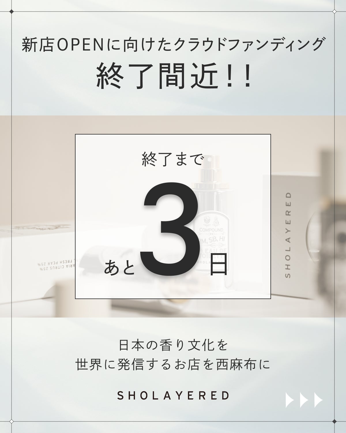 SHOLAYERED 西麻布店 グランドオープンを記念して、特別な福袋を発売いたしました!クラウドファンディングのリターン品とは異なる内容となっております。総額74%オフの太っ腹な割引率。人気アイテムをたっぷり詰め込んだ、お得で贅沢なセットです。数量限定でのご用意ですので、ぜひお早めにチェックを!▼商品ページはこちらhttps://sholayered.jp/products/grand-open-nishiazabu_happy-bag今後ともSHOLAYEREDをどうぞよろしくお願いいたします。┈┈ ❁ セット内容 ❁ ┈┈❁ 1945 オードトワレ香り:ライトグリーン¥16,940 ❁ ディフューザー 500ML香り:ランダム¥16,280❁ ディフューザー 100ML香り:ランダム¥5,280❁ フォーミングウォッシュ香り:ネロリ&グレープ¥3,740通常価格合計 ¥42,240福袋特別価格 ¥11,000