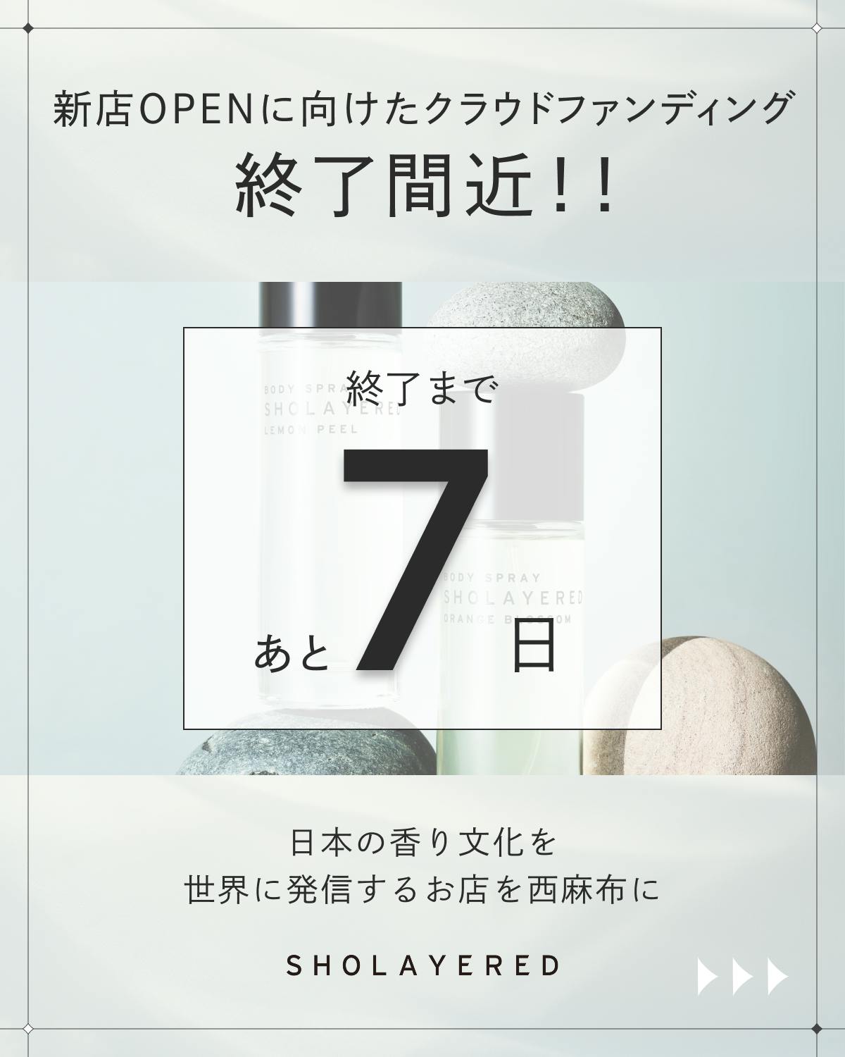 終了までのカウントダウンが始まりました。まだまだ多くの方にSHOLAYEREDの世界観と、日本の香り文化の可能性を知っていただきたいと思っています。