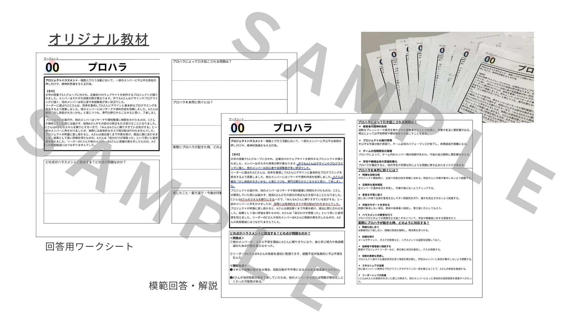 ・オリジナル教材を使用し、各ハラスメントごとの事例をもとに問題点や改善策を考える