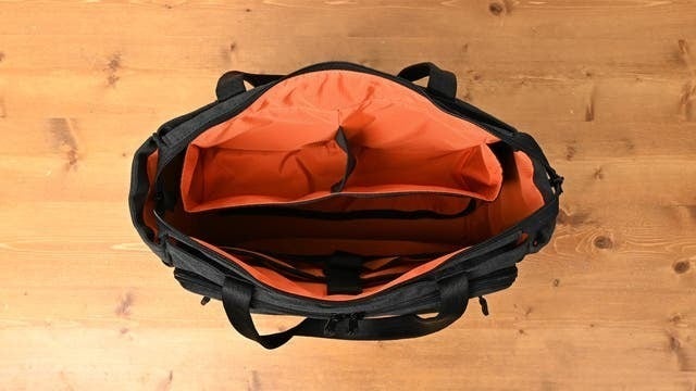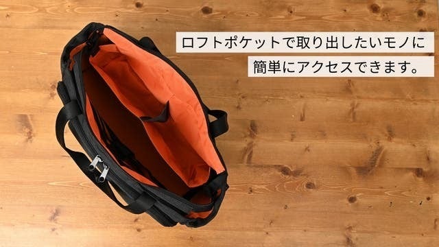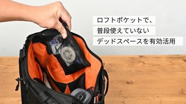 そこで上部のデッドスペースに立体的なロフトポケットをつけました。マチが広く、ポケットというより引き出しのように使えるから、出し入れの多いアイテムを収納したくなります。