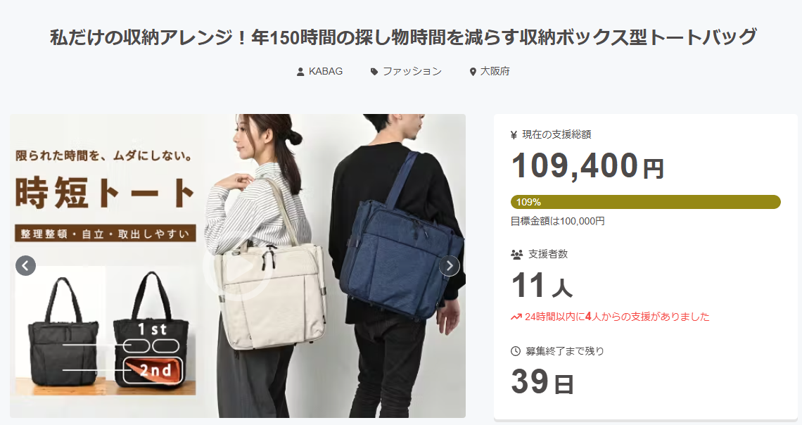 2025/03/12 09:40皆さまの温かいご支援、誠にありがとうございます!本プロジェクト「KABAG 収納ボックス型トートバッグ」は、 皆さまのおかげで目標金額10万円を達成いたしました!本日(3月12日9時30分)時点での支援総額は109,400円、支援者数は11名となり、順調なスタートを切ることができました。ご支援くださった皆さまに心より感謝申し上げます。しかし、プロジェクトはまだまだ続きます! 残り39日となるこの期間、さらに多くの方々に「KABAG 収納ボックス型トートバッグ」の魅力をお伝えし、より多くの支援をいただけるよう尽力してまいります。引き続き、応援よろしくお願いします! まだ支援を検討中の方は、ぜひプロジェクトページをご覧ください。 ご支援いただいた方は、SNSなどでシェアしていただけると嬉しいです。今後も進捗情報や開発の裏側、活用方法などを発信していきますので、どうぞお楽しみに! 引き続き、応援のほどよろしくお願いいたします!プロジェクトページはこちら:KABAG収納ボックス型トートKABAG もっと見る