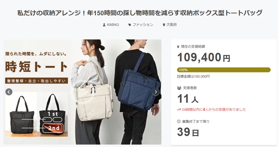 しかし、プロジェクトはまだまだ続きます! 残り39日となるこの期間、さらに多くの方々に「KABAG 収納ボックス型トートバッグ」の魅力をお伝えし、より多くの支援をいただけるよう尽力してまいります。