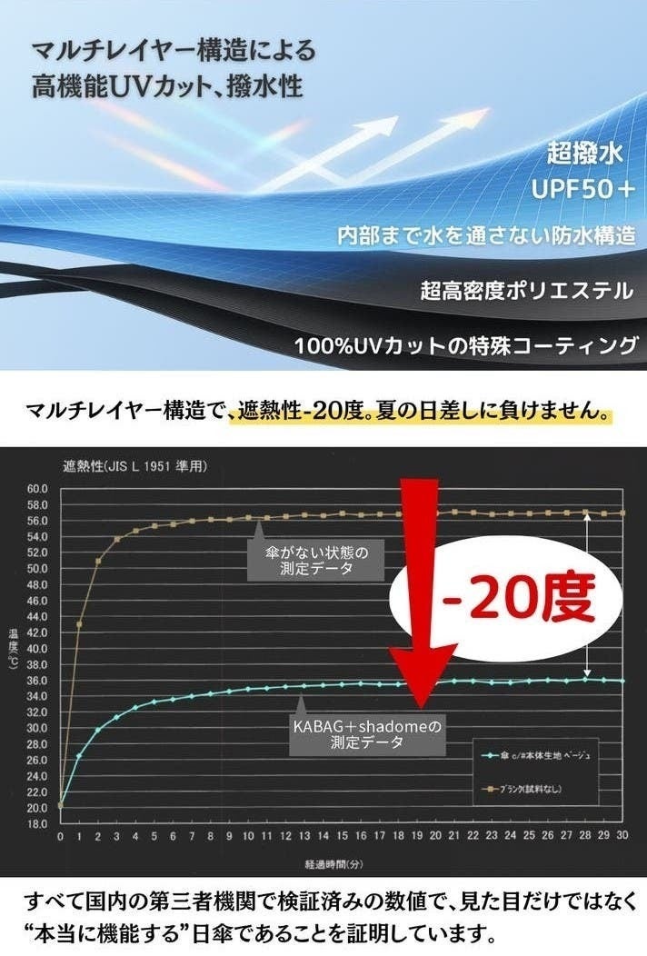 JIS L 1951準用の遮熱性試験を実施。一定の光源を照射し、30分後の生地表面温度を測定したところ、生地なしの状態と比較して21.2℃の温度差が確認されました。表示の数値は特定の試験環境で得られたものであり、実際の使用環境での効果を保証するものではありません。