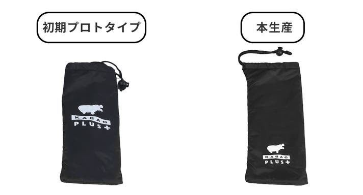 違いは傘袋正面のロゴの位置と大きさです。皆さまにお届けするものは、本生産仕様に準じた、ロゴを小さくし、袋の下の方に配置したものになります。