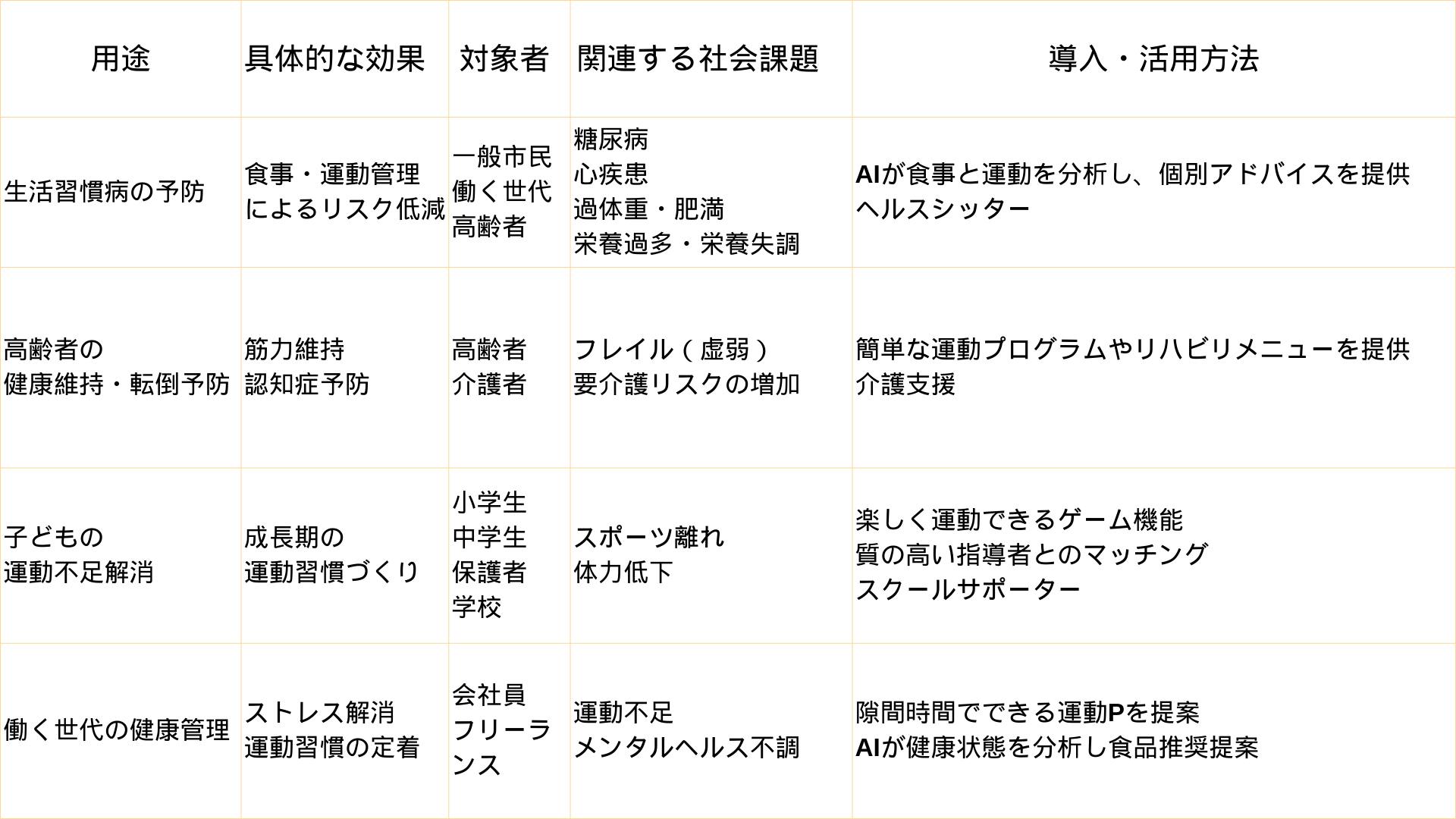 🏢 福利厚生の充実:社員向けに健康管理アプリを提供し、生産性向上や離職率の低下につなげる。