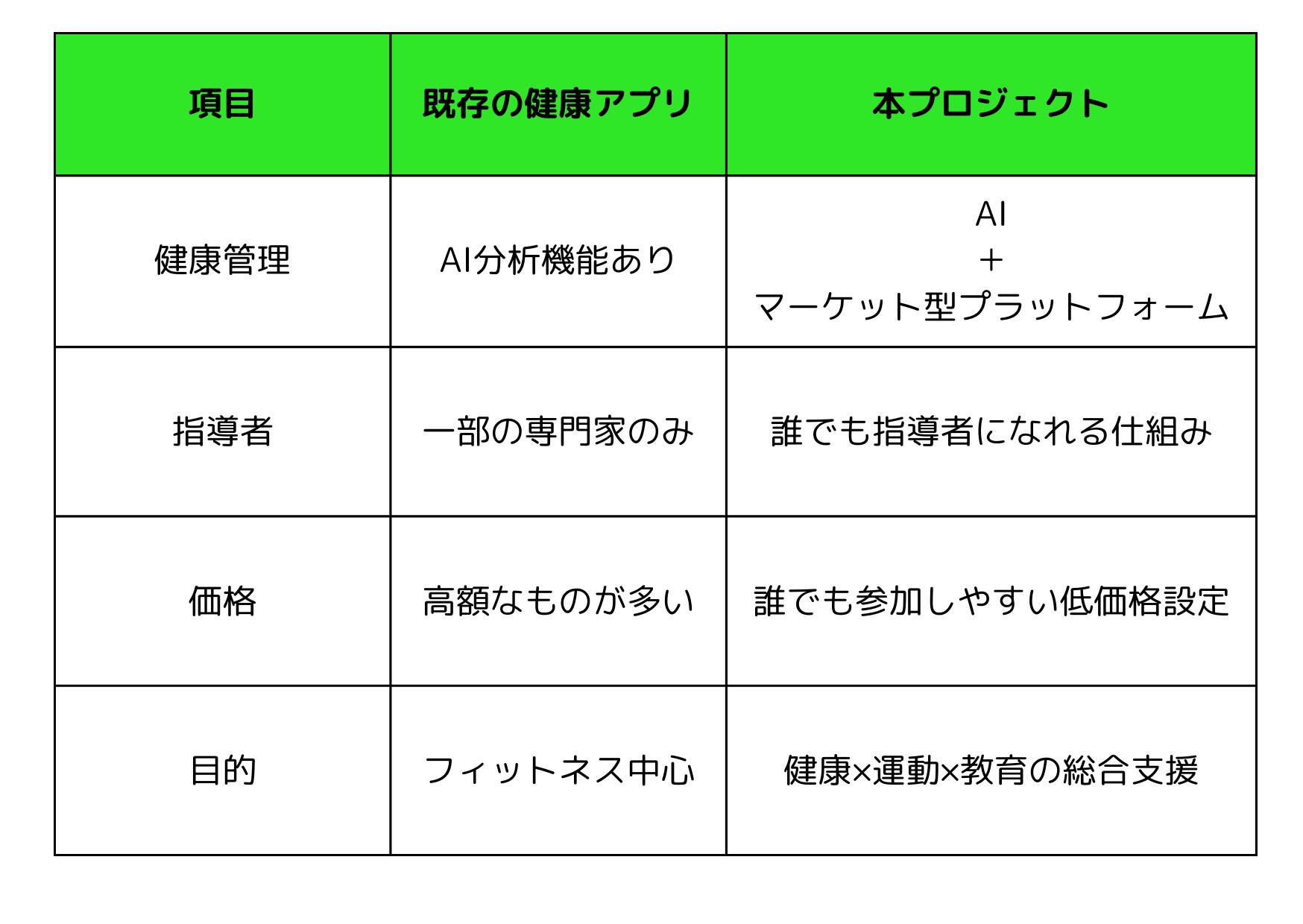 フィットネス業界への関心が高まり、運動指導者や健康維持に努める人々の需要が増加しています。本プロジェクトでは、個々の体力や生活習慣に応じた健康指導を行い、データを活用して健康状態を可視化し、長期的な健康維持を支援する環境を整備します。