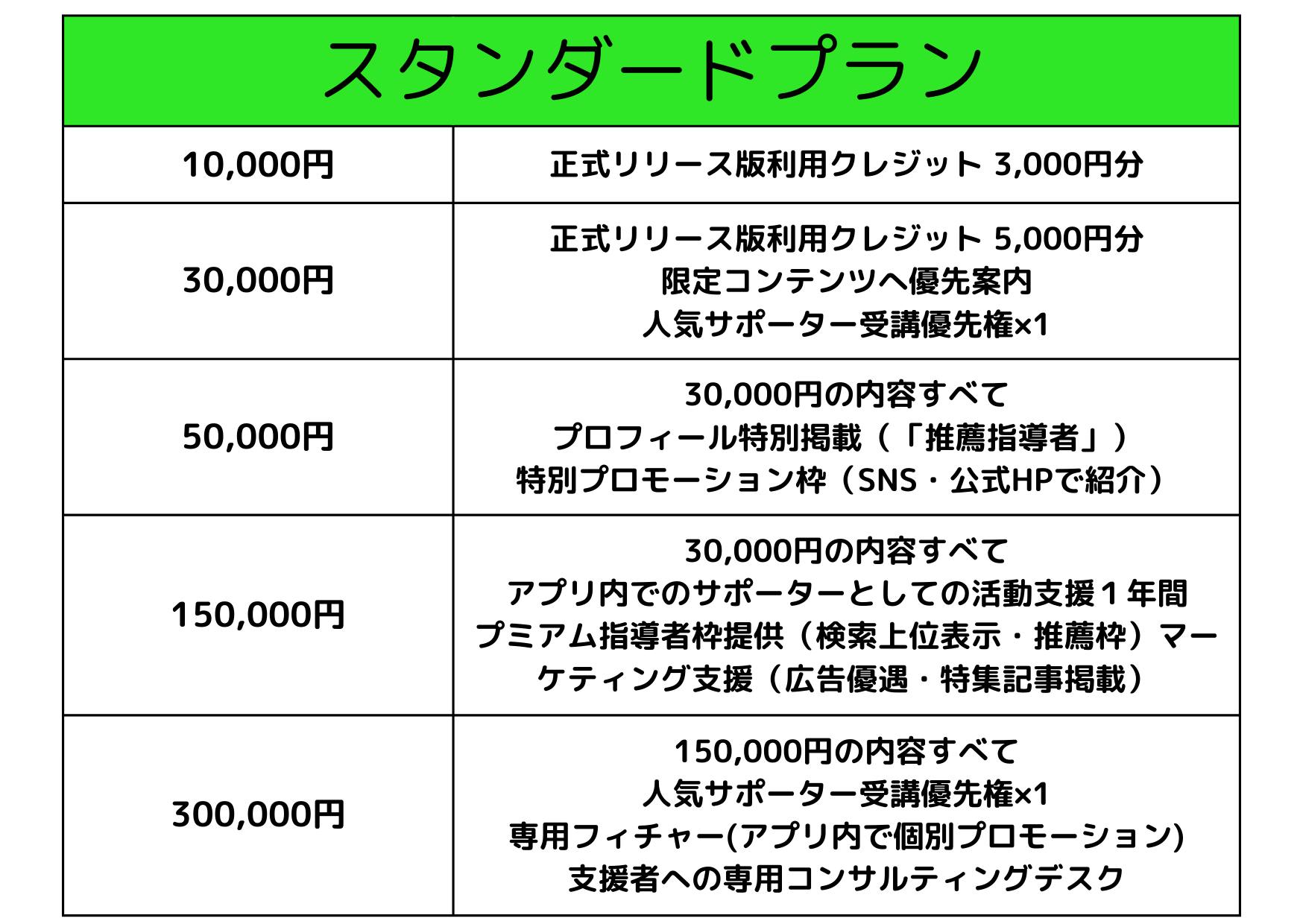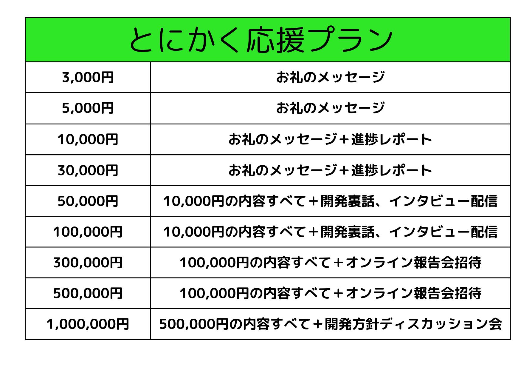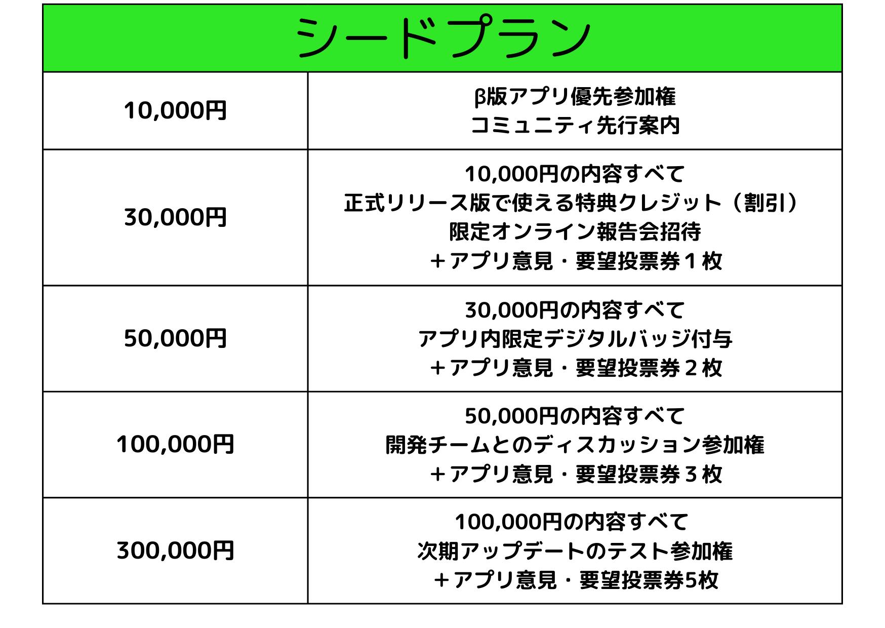 一般の支援者向け(とにかく応援プラン / 一緒につくるプラン / シードプラン / スタンダードプラン)