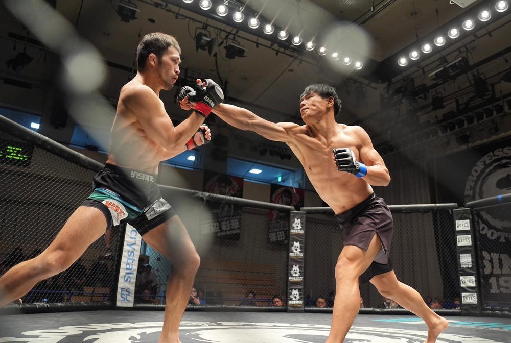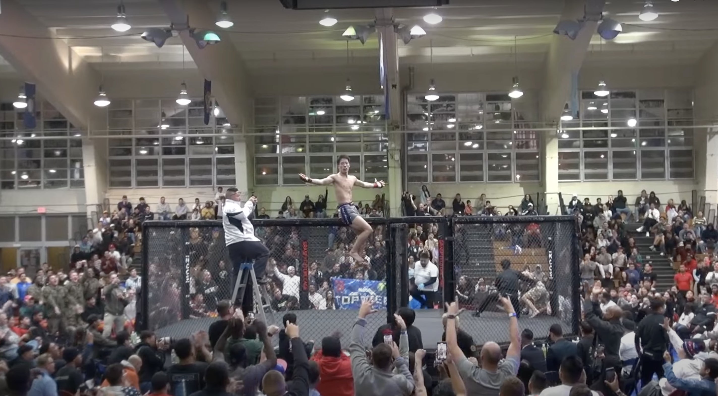 トップティア3期生の横川がオクタゴン(金網リング)の上で勝利をアピールする姿。このような大会を高知県で開催したい!