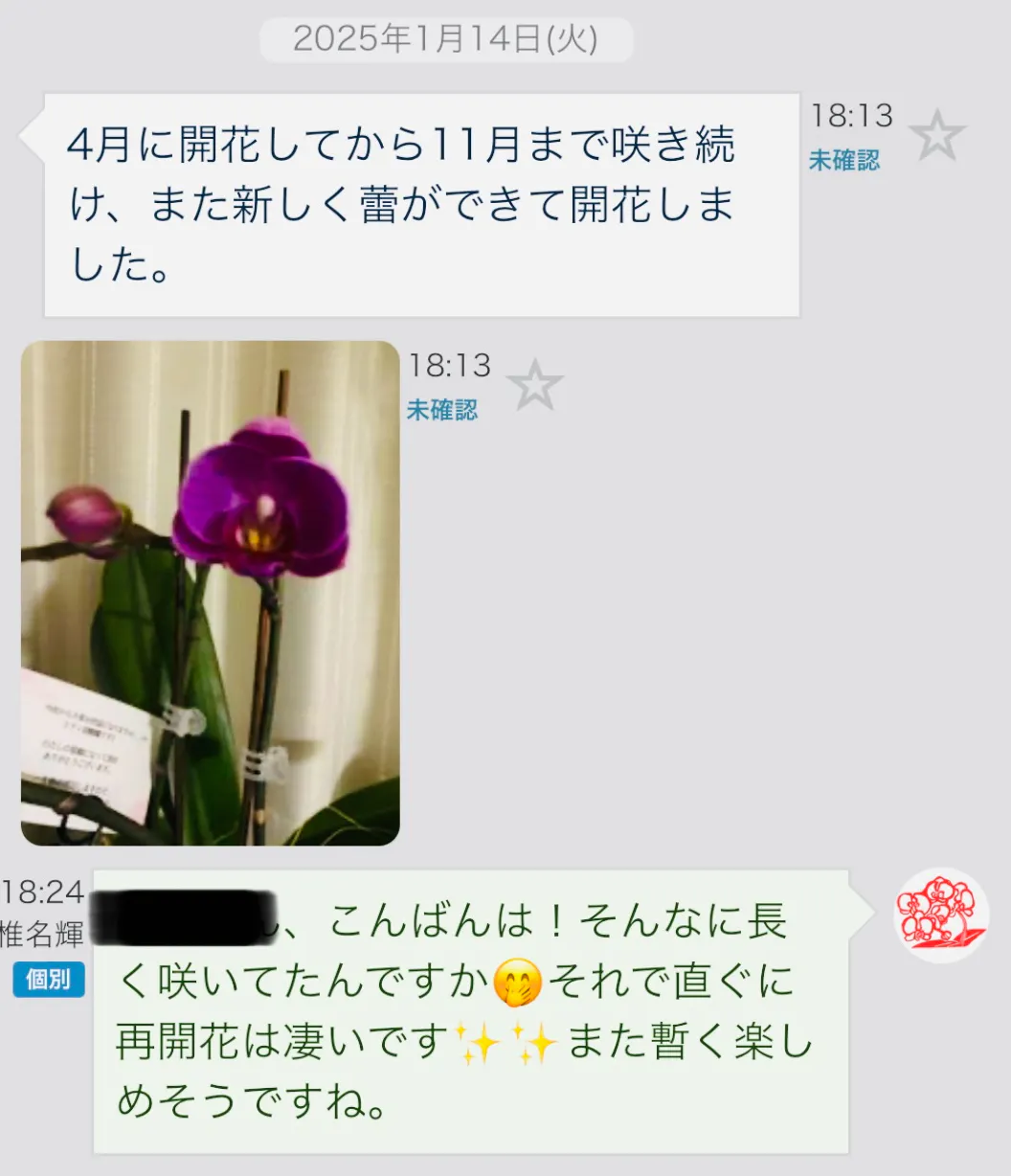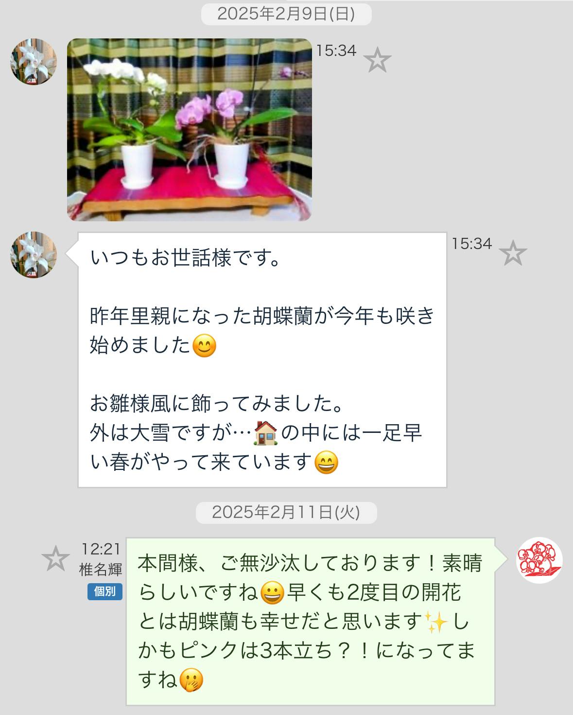 2025/05/11 15:00昨年お送りした里親胡蝶蘭の支援者様からご連絡を頂きました。【事例1】写真をみて驚きましたが、たった1年で板付、更に綺麗に枝垂れて開花しております。この品種はナオミゴールドといって2019年に日本一の新品種に輝いた胡蝶蘭です!幸せそうな胡蝶蘭本来の姿で生き生きとしていますね。昨年支援のお客様で興味がある方は是非板付にもチャレンジしてみてくださいね。美しい!!【事例2】こちらはアンスラパレルモというとっても花持ちが長い品種なのですが、前の花が枯れる前に次の花が咲いた事例です。約一年も咲き続けたとの事で、私もはじめて見た事例でした。一年中ずっと咲いているとは、管理がいいことと胡蝶蘭の生命力の強さの象徴ですね。このように、お客様の元で元気に咲いている姿が何よりの便りでございます。まだ胡蝶蘭を育てたことがないというお客様も是非チャレンジしてみて下さいね。 もっと見る