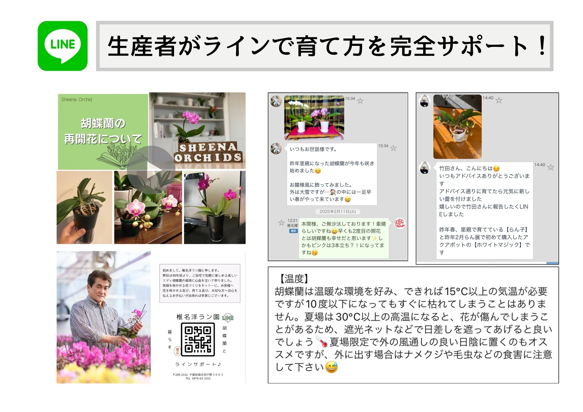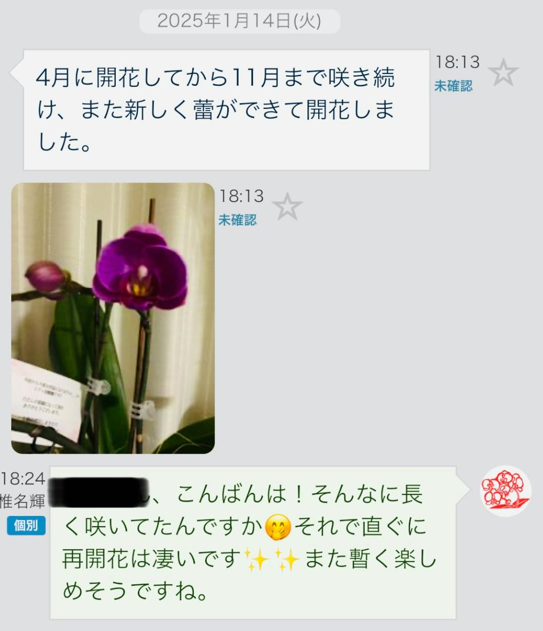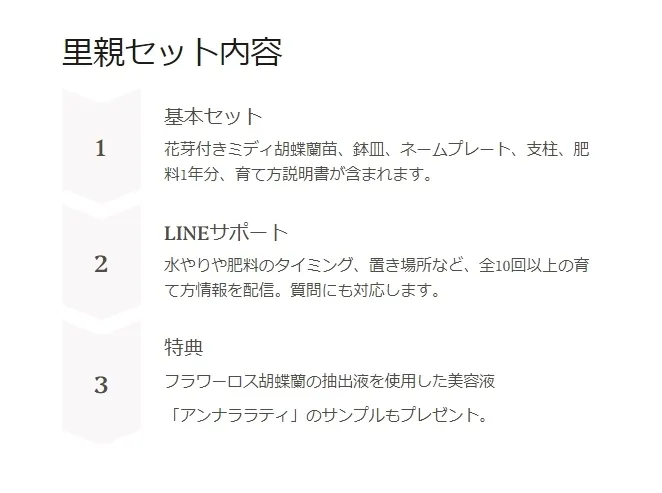 付属の育てからサポートQRコードを読み込むと、1週間に1度の水やりのお知らせや、最適な置き場所、胡蝶蘭品種情報など、全10配信以上を予定しています。ラインで直接質問をすることもできます。