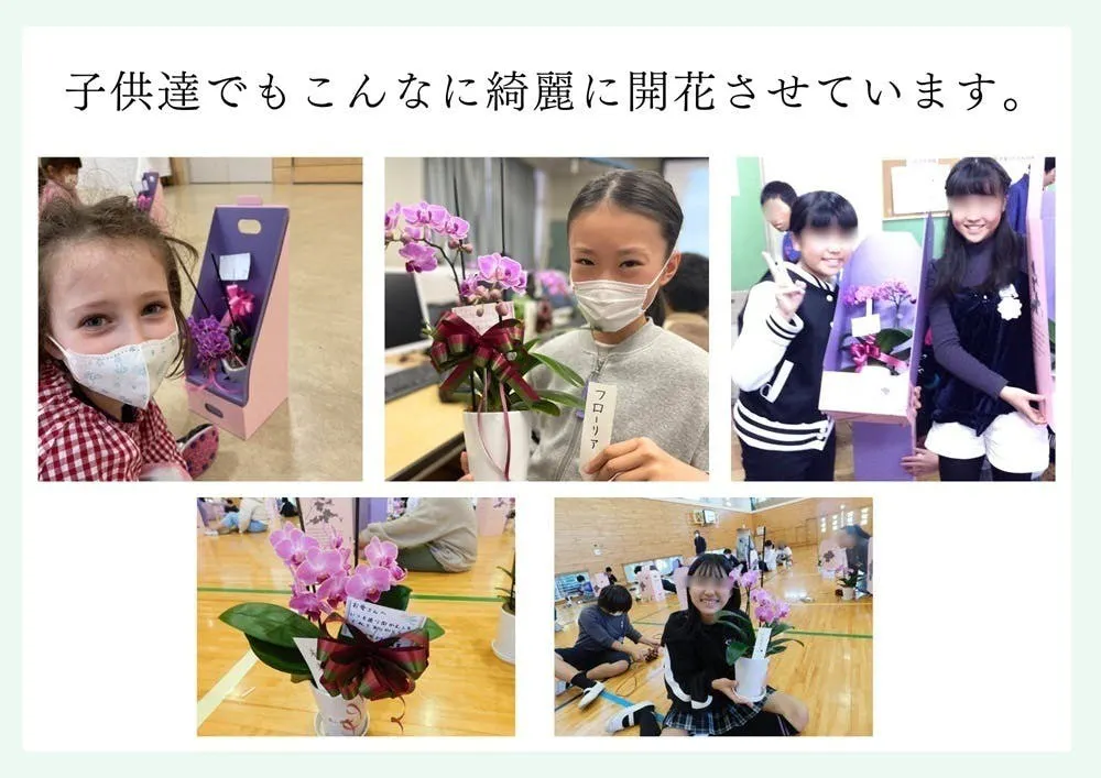 私達は2015年より、学校等で胡蝶蘭の苗を育て、花を咲かせて大切な人へプレゼントする事を目的とした授業、「大切な人のために花を咲かせるカリキュラム」を実施してきました。主に小学校・中学校、高校、大学、児童養護施設、障害者学校、デイサービス施設、少年院などで約30ヶ所・累計2500人が参加して開花に成功しています。丈夫でしっかりした胡蝶蘭であることと、生産者の的確なサポートがあれば胡蝶蘭を咲かせることは難しいことではありません。今までの花育授業で最年少は6歳、最年長では102歳の方が開花に成功しています。