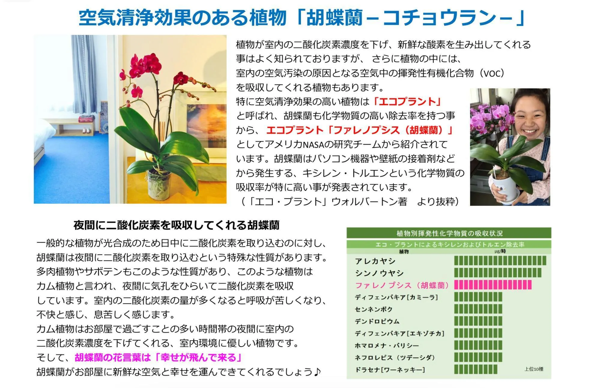 胡蝶蘭には空気清浄能力があることを知っていましたか?「エコプラント」と呼ばれ、NASAの研究でホルムアルデヒドやキシレン・トルエンなどの化学物質を吸収し、夜間に貯まるCO2を吸収してくれています。お家に飾るには空気清浄の面も含めて実は最適な植物なんです!!!
