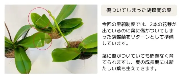 贈答品需要が多い胡蝶蘭では、葉に傷がついている物をお送りするわけにはいきません。そうして残されてしまったミディ胡蝶蘭達が悲しくも破棄せざるを得ない状況になり、毎年多くの胡蝶蘭が破棄されてしまっています。ですが胡蝶蘭は葉に傷がついていても、綺麗に開化する力を宿しており、適切なお世話をして頂ければ約2ヵ月で開花します。