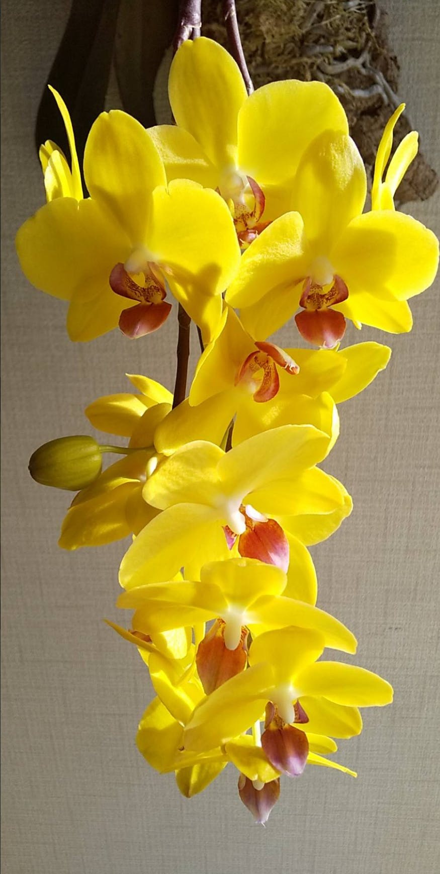 写真をみて驚きましたが、たった1年で板付、更に綺麗に枝垂れて開花しております。この品種はナオミゴールドといって2019年に日本一の新品種に輝いた胡蝶蘭です!幸せそうな胡蝶蘭本来の姿で生き生きとしていますね。昨年支援のお客様で興味がある方は是非板付にもチャレンジしてみてくださいね。美しい!!