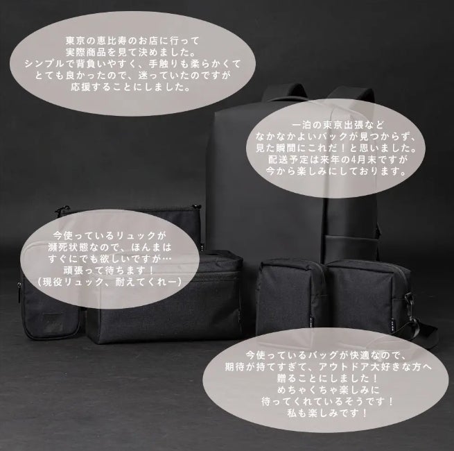 進行中のプロジェクト「FULL FUNCTION BACKPACK」も、ついに残り1ヶ月を切りました!たくさんの皆様から温かいご支援をいただき、心より感謝申し上げます。プロジェクト完了まで引き続き応援をよろしくお願いいたします。私たちが自信をもってお届けする「FULL FUNCTION BACKPACK」は、これまでの経験と皆様からのご意見をもとに改良を重ね、機能性とデザインを追求した自信作です。ぜひその魅力を感じていただければと思います。また、応援メッセージをいただけるとスタッフ一同とても励みになりますので、ぜひお気軽にお寄せください!今回は頂いた応援メッセージの一部をご紹介します!実物をご覧になり気に入ってくださった方や、すでにKLONのバッグをご愛用いただいている方から期待のお声をいただくなど、多くの方にご支持いただいております。ビジネスリュックをお探しの方からもご注目いただいており、大変嬉しく思っております。他にも多数の温かいメッセージをいただき、本当にありがとうございます!ご質問やご不明点がございましたら、どうぞお気軽にお問い合わせください。実物を見てみたい!という方は、KLON店舗各店に商品がありますので、お時間ある方はぜひご覧になってみてください!最後まで皆様のご支援をどうぞよろしくお願い申し上げます!<商品展示店舗情報>■KLON東京恵比寿店住所:東京都渋谷区恵比寿1丁目26-18電話番号:070-5347-2501通常営業時間:11:00-20:00(変動あり)https://klonklonklon.com/apps/note/channel/ebisu/■KLONルクア大阪店住所:大阪市北区梅田3-1-3 ルクア5F電話番号:06-6147-5959通常営業時間:10:30-20:30https://klonklonklon.com/apps/note/channel/lucua/▼プロジェクトはこちらからご覧ください。https://camp-fire.jp/projects/826447/preview