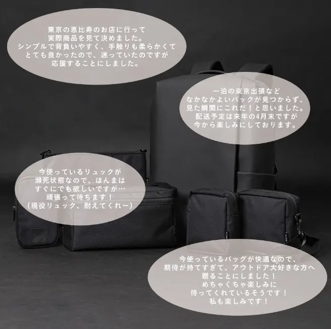 実物をご覧になり気に入ってくださった方や、すでにKLONのバッグをご愛用いただいている方から期待のお声をいただくなど、多くの方にご支持いただいております。