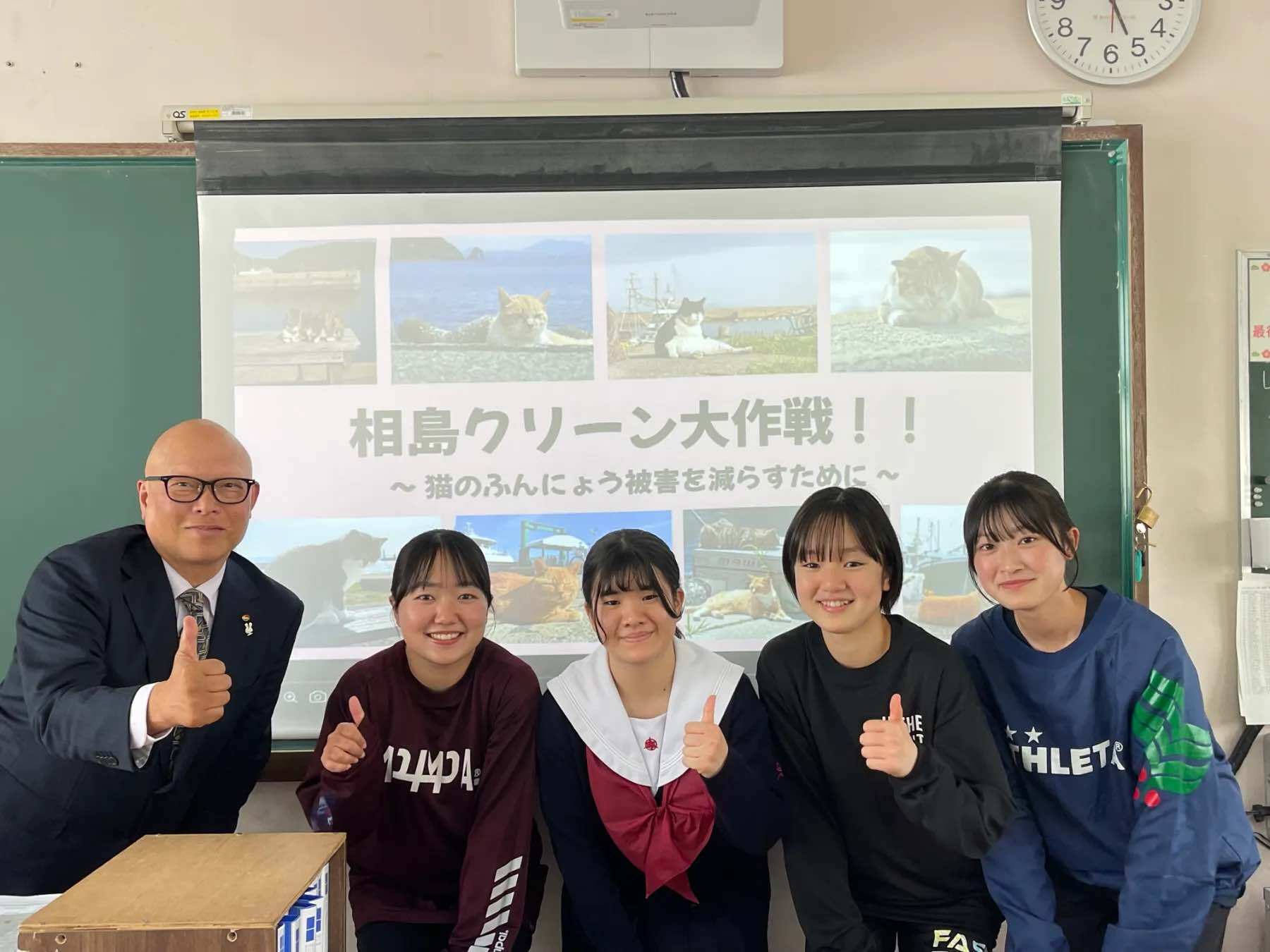 2025年4月24日 新宮高校にて元1年4組4班の「あやのさん、さわさん、みなみさん、かりんさん」が、新宮町産業振興課の皆様のご協力により「相島クリーン大作戦」(猫のふんにょう被害を減らすために)のプレゼンテーションをしてくださいました。猫の「フン」を使った堆肥で相島の作物を作っていきました!