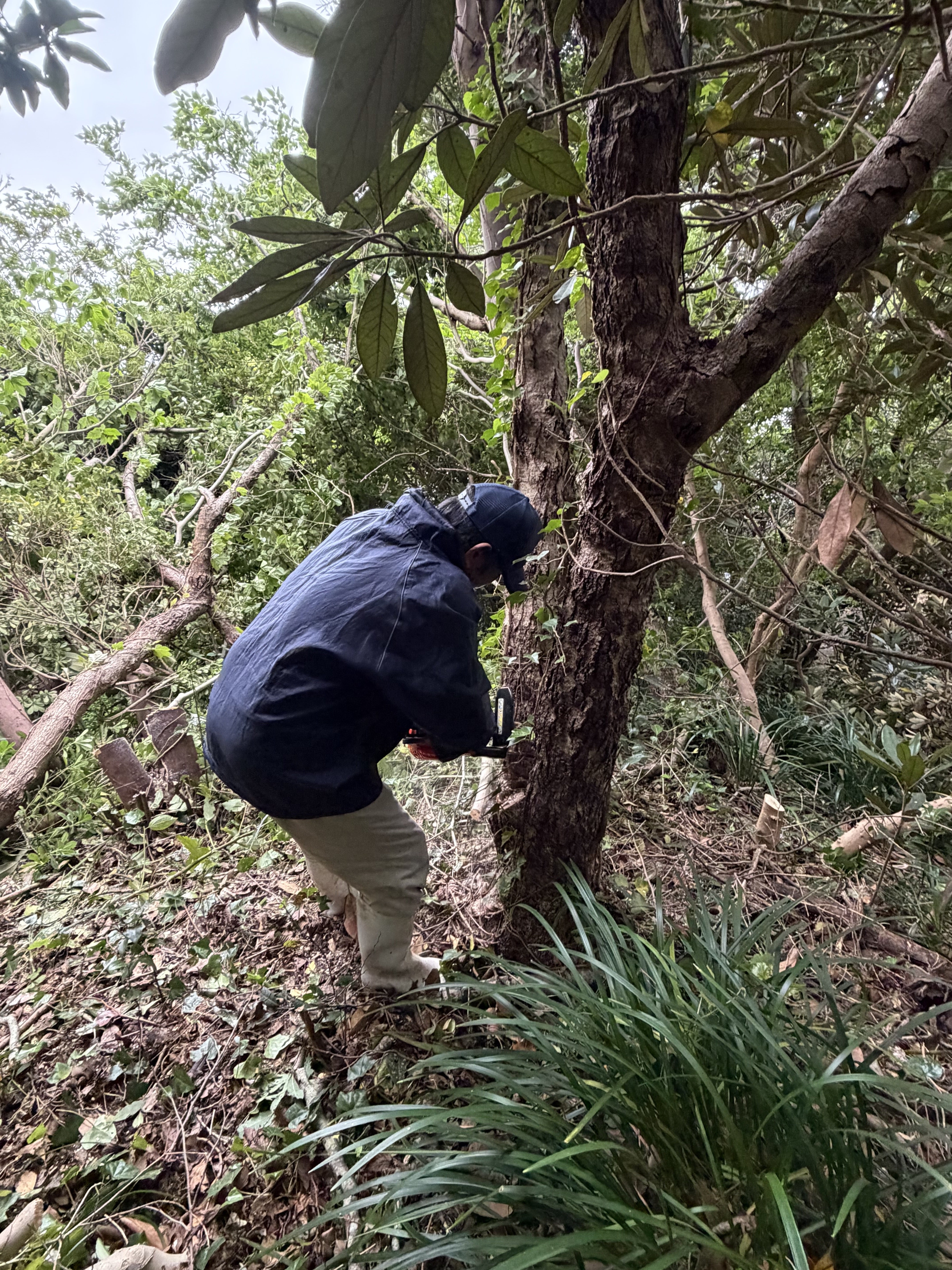 篠崎区長とともに、展望台建設予定地である北部展望台のさらに上、相島で最も標高の高い場所にて、伐採作業を開始いたしました。