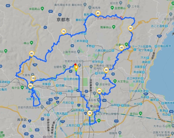 京都市北区の自宅から京都一周トレイルの始点伏見稲荷(最近延長され始点が変わったとか)まで約10km、終点の苔寺から自宅までの約10kmを足した「自宅発着京都一周トレイル(top画像)」にするとほぼ100km(上りの合計は4,500mくらい)になるので、遠征に行けない憂さ晴らしや自己満足感を得るために、これまでに何度か一周し、それを「トルデジアン対策」のシンボルにしています。