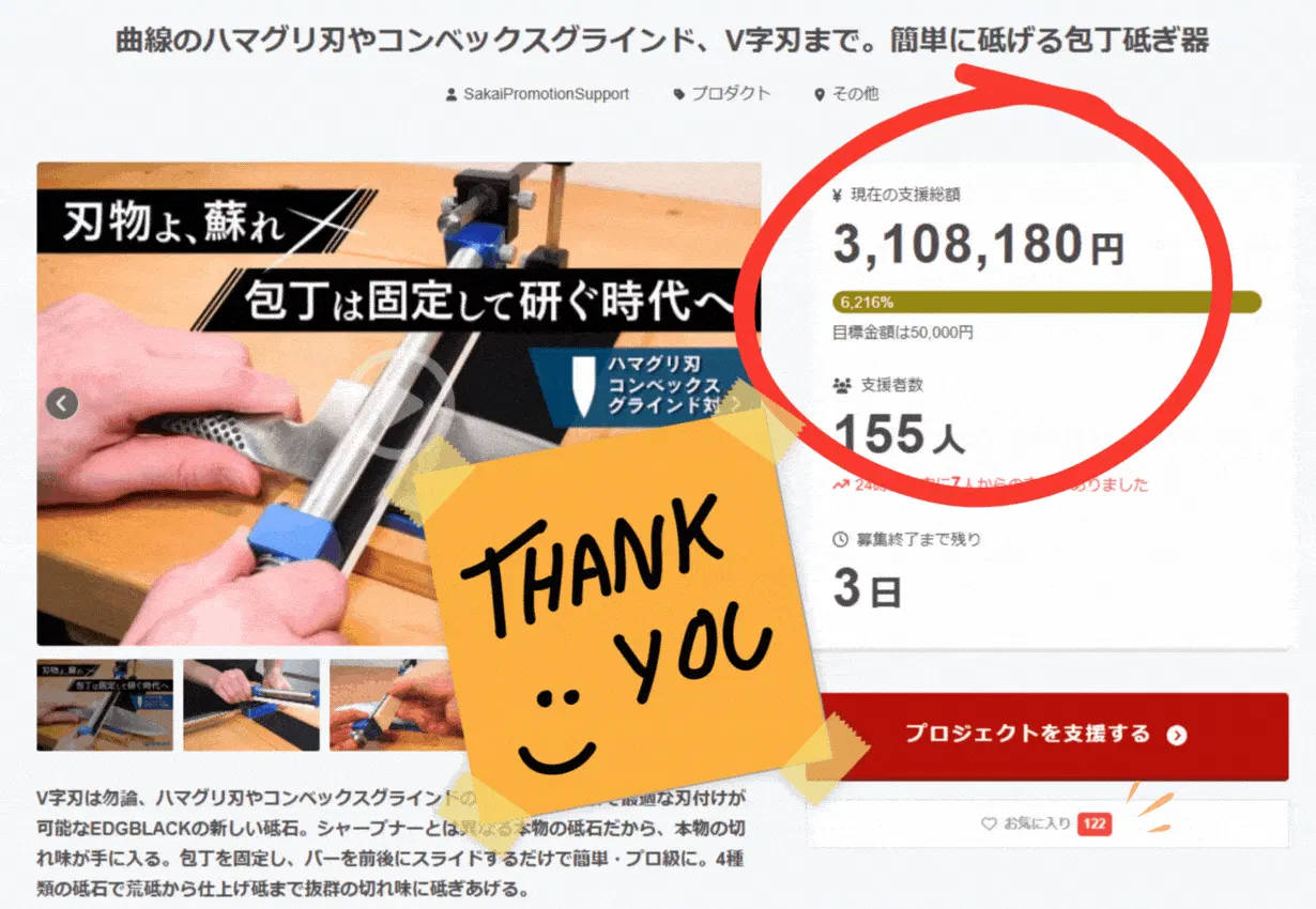 現在「EDGBLACK Knife Sharpener Curve」プロジェクトは皆様からの熱い応援のおかげで、何と支援総額300万円を突破いたしました!皆様の多大なるご支援に大変感謝しております...!!