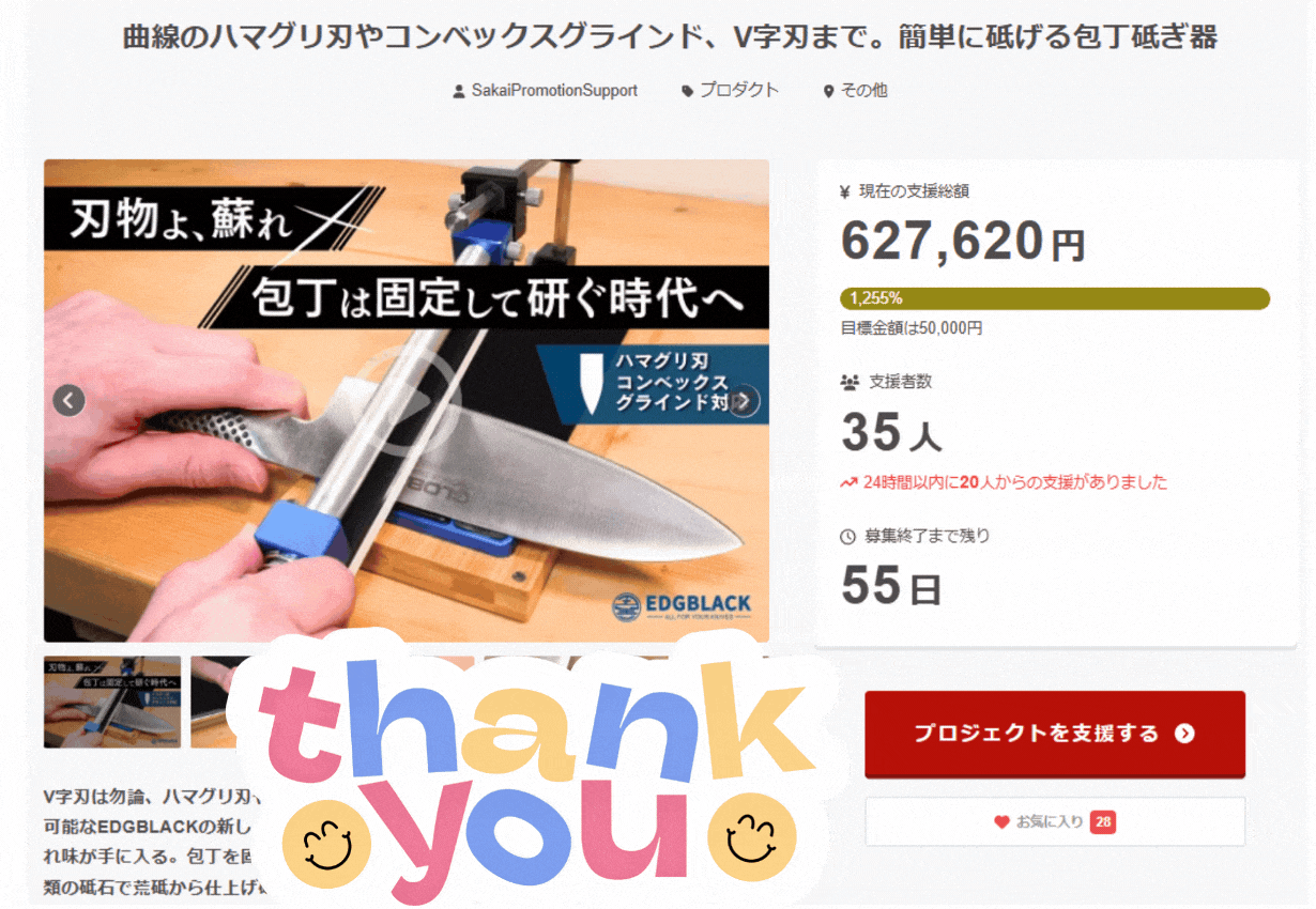 お世話になっております!EDGBLACKプロジェクト担当です^^本プロジェクトへのご支援・ご応援、誠にありがとうございます!本日「EDGBLACK Knife Sharpener Curve」を【人気のプロジェクト】に選出していただきました!より沢山の方に知っていただきける機会が増えるということで、とても嬉しいニュースです!また3月7日現在の爆速割リターン個数について、『残り11個しかない』状況となっております!少しでも『お得にご購入できる希少なチャンス』ですので、是非お買い逃がしのないようにご注意・お急ぎくださいませ!!サポーターの皆様及びそのご家族の方が包丁・ナイフを上手に砥げるようになることで、『料理や趣味をもっと楽しく・もっと上手に・もっと充実できる』ようなサポートが出来るよう、ますます努めてまいります!引き続き応援のほどよろしくお願いいたします。