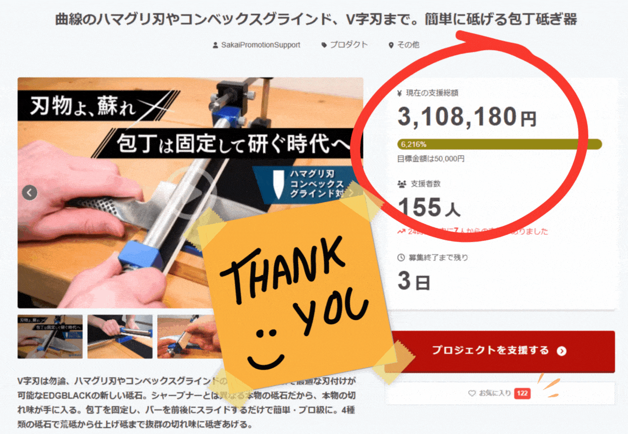 【EDGBLACK Knife Sharpener Curveプロジェクトご支援者の皆さまへ】お世話になっております!EDGBLACKプロジェクト担当です^^本プロジェクトは、2025/4/30をもちまして無事大盛況のまま終了いたしました!これもひとえに皆さまの温かいご支援とご愛顧のおかげです。心より厚く御礼申し上げます!!^^皆さまのご支援とご協力により、支援総額は431万円を超え、総サポーター数は213名となりました!これほど多くの方々からの支援を得られたこと、大変光栄に存じます!!本当に、本当にありがとうございました!!!^^配送につきましては、予定通り、それ以上のペースで配送ができるよう、全力で準備を進めてまいります!進捗は、随時活動報告を通じて皆さまにお知らせさせていただきます。尚、お届け先のご住所が変更となる場合は、事前に住所をご変更くださいませ。出荷準備が完了しますとお届け先の変更ができなくなりますので、お早めに対応をお願いできますと幸いです!さて、プロジェクトの終了は一つの節目ではありますが、これからも高品質な製品とサービスを提供するため、一層の努力を重ねてまいります!尚、今後の一般販売や新規プロジェクトなどについてはInstagramや公式LINEで告知いたしますので、この機会に是非フォロー・お友だち追加をいただけますと幸いです!!▼Instagramhttps://www.instagram.com/sakaihomeselect/▼公式LINEhttps://lin.ee/X2VrlpN今後とも変わらぬご支援とご愛顧を賜りますよう、よろしくお願い申し上げます!!^^感謝の気持ちを込めてEDGBLACKプロジェクト一同より