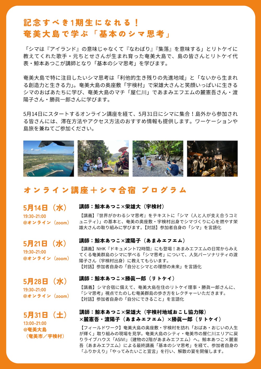 5月14日にスタートするオンライン講座を経て、5月31日にシマに集合!島外から参加される皆さんには、滞在方法やアクセス方法のおすすめ情報も提供します。ワーケーションや島旅を兼ねてご参加ください。